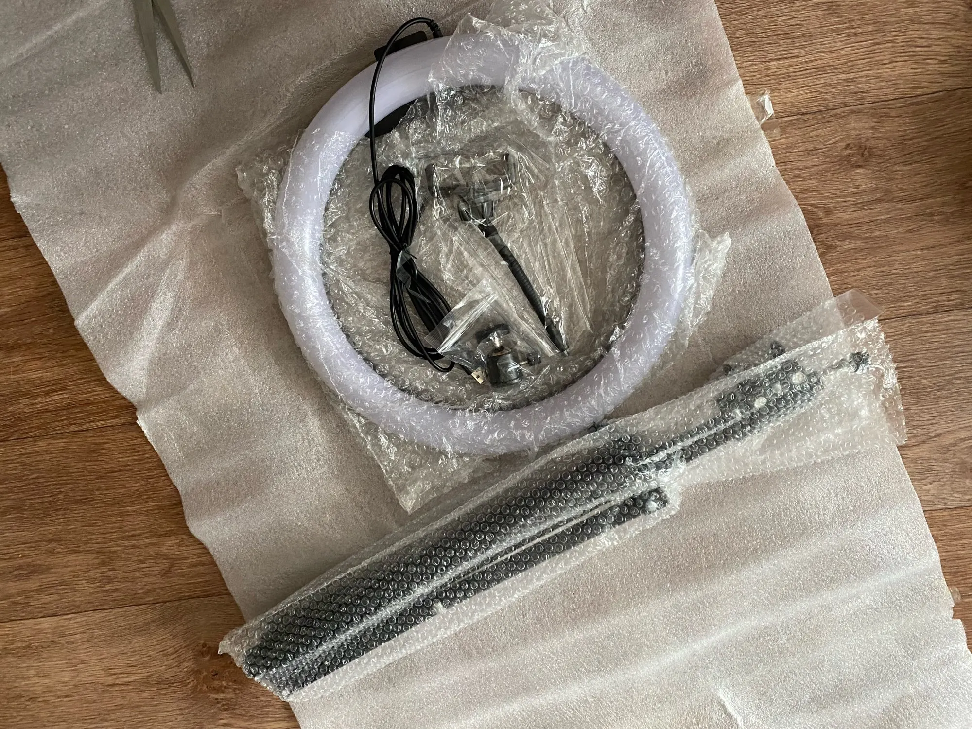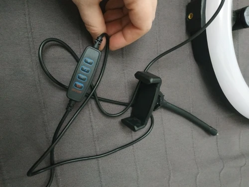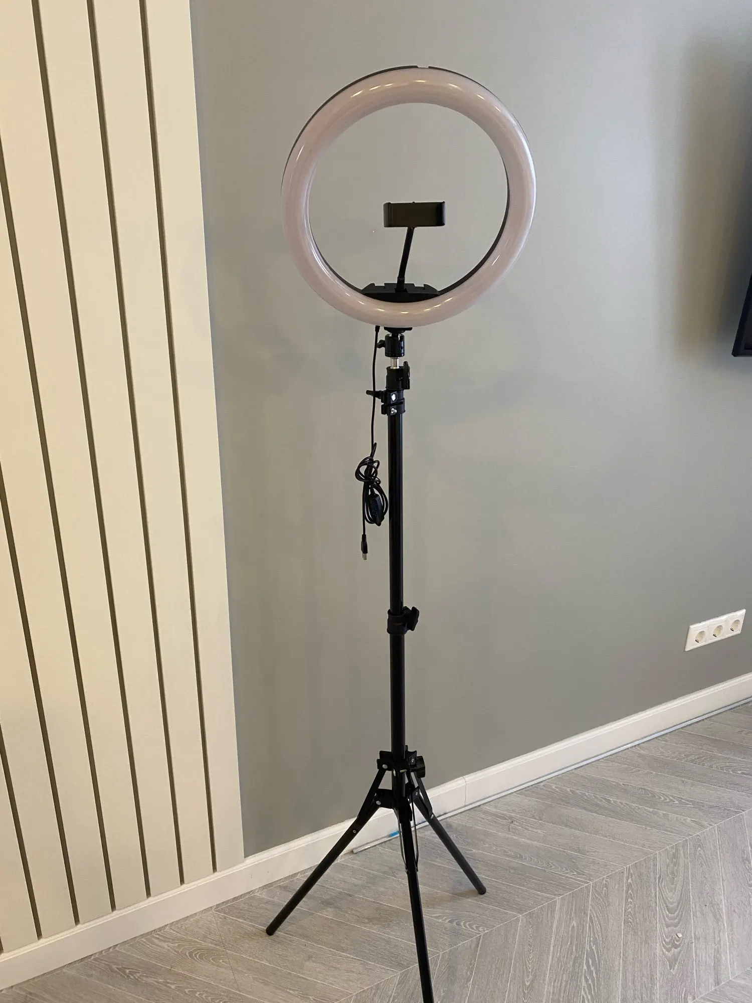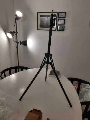 Товар пришёл быстро. Упакован нормально, хоть упаковка немного повредилась, все в целостности. Внутри нет инструкции, но сборка очень лёгкая и я справилась за минут 5. Держатель для телефона хорошо фиксируется и гибкий, в комплекте нет вилки, но я об этом знала. Все работает хорошо, товар мне понравился. Взяла самый высокий 200 см, мой рост 174 см. В принципе если снимать стоя, то достаточно 150-160 см, не помню точно какой из вариантов у них представлен. Товар рекомендую.