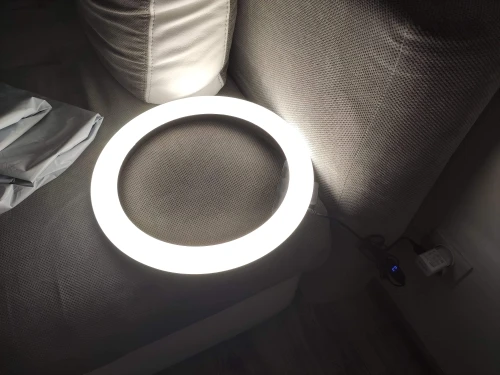 Да, выглядит хорошо. Но световое кольцо не более 32 см по внешней окружности, 24.5см внутренний размер. Параметры указаны не верно. На коробке написан размер 33см. Требует мощный Блок питания, максимальная нагрузка 2400 мА при смешаном цвете в Белый свет. Синий 6000-6500К свет и Желтый 4000К светят слабее, потребление менее 1800мА. Яркость света - Белый 190 люкс, Синий 140 люкс, Желтый 135 люкс, регулировка уменьшения яркости. Отключение кнопкой, помнит последний режим цвет и яркость. Отключение питания, не помнит режимы, при включении кнопкой максимальный белый свет. Как изделие хорошее.