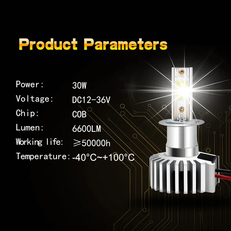 Упаковка включает:1 комплект светодиодный лампы для фар (2 шт. лампы)ПараметрыМощность: 60 Вт/комплект (30 Вт/лампа)Напряжение: 12 В ~ 36 В постоянного токаЧипы: высокоинтенсивные чипы COBСветовой поток: 12000 лм/комплект (6000лм/лампа)Цветовая температура: Белый 6500KКласс водонепроницаемости: IP68Угол обзора: 2 стороны 280 ° излучающийКорпус: литой алюминиевый корпусРабочая температура:-40 ℃ ~ 100 ℃Срок службы:>50000 часовГнездо: H3,H1,H11,H8,H9,9005,9006,H4,H7Простая установка: Plug & PlayПодходит для большинства автомобилей, мотоциклов, моторов, грузовиков, квадроциклов, UTVs и большинства транспортных средств.Гарантия: 1 год