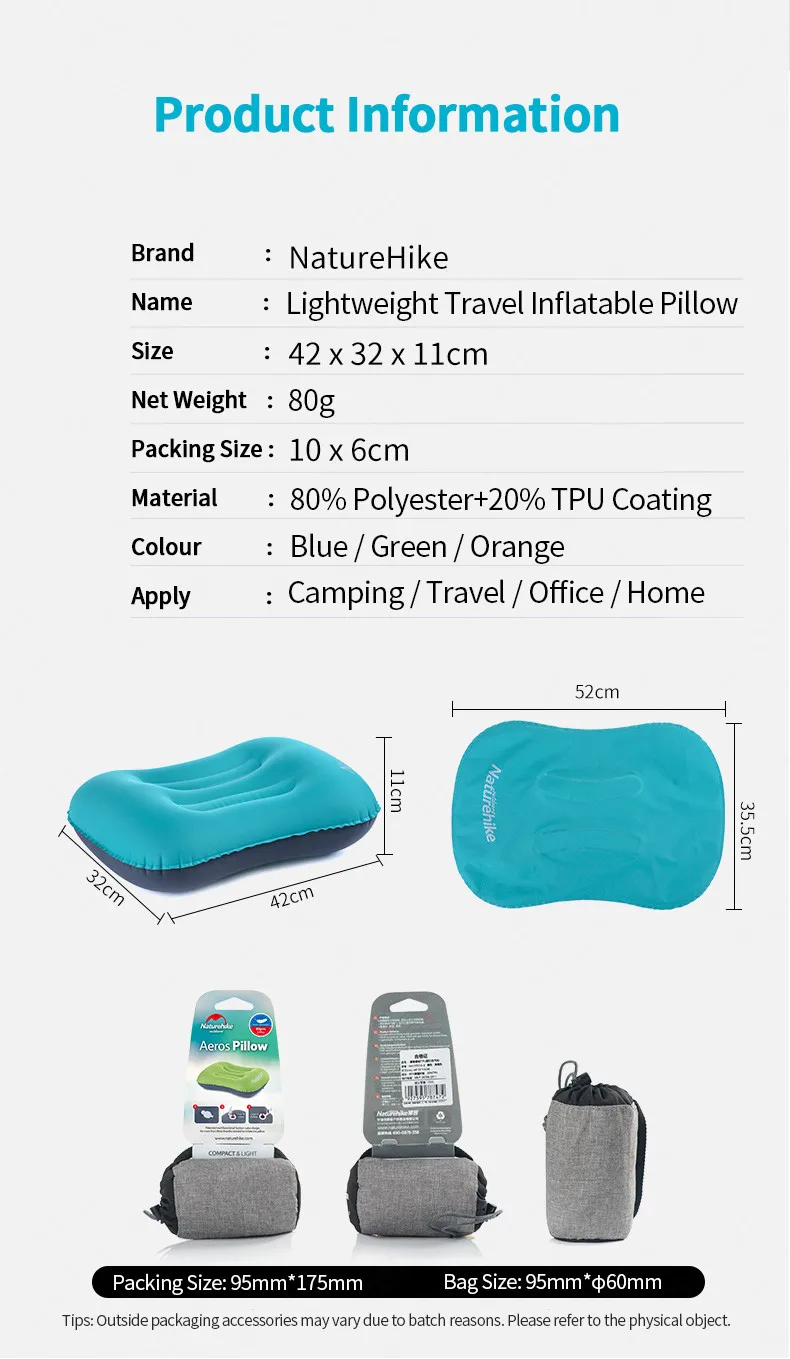 Надувная подушка для сна NaturehikeМатериал: ТПУ полиэстерРазмер: 420x290x110 ммРазмер в сложенном виде: 100x60 ммЦвета: оранжевый/зеленый/синийВес нетто: около 86 г Особенности: Сверхлегкий, небольшой складной размер, портативный