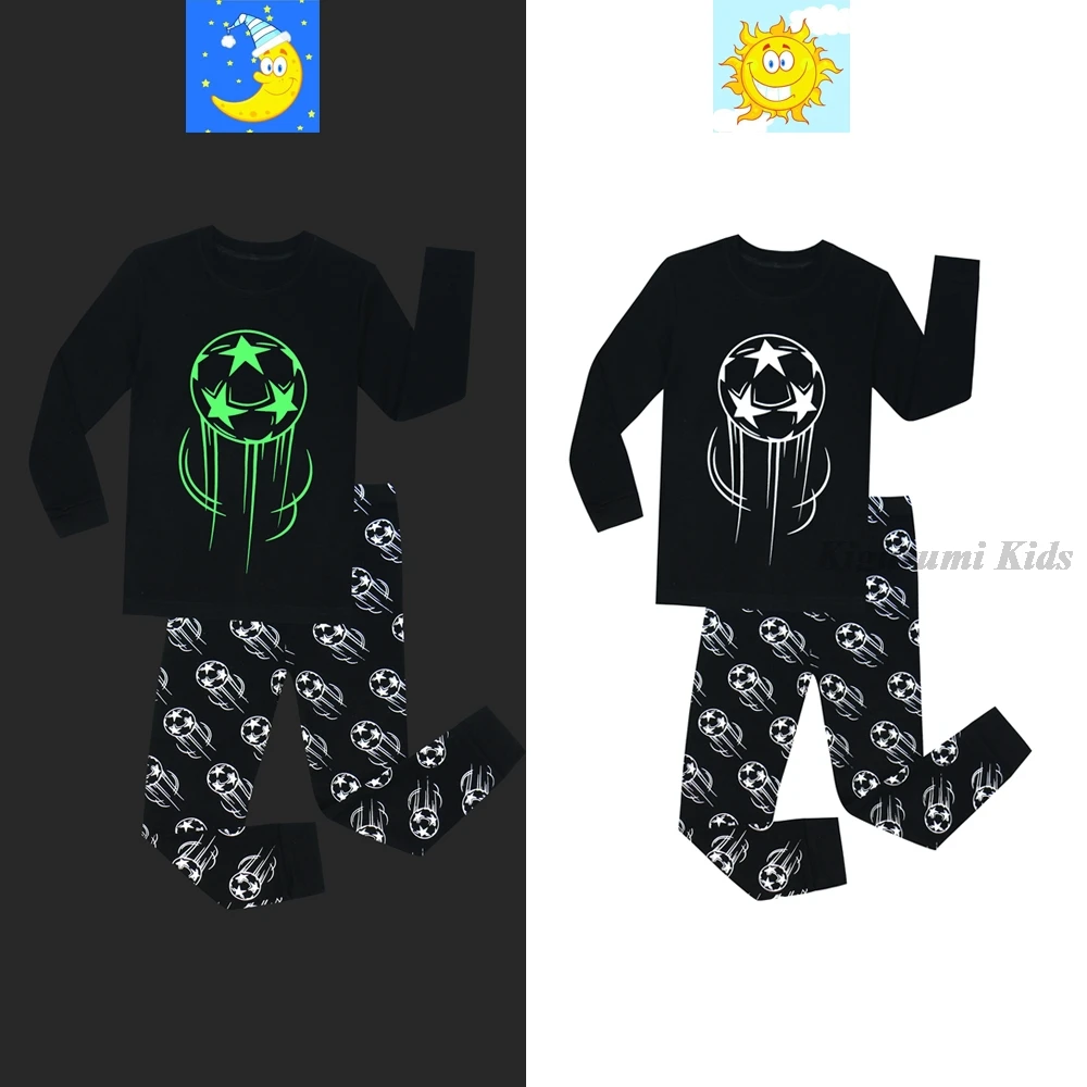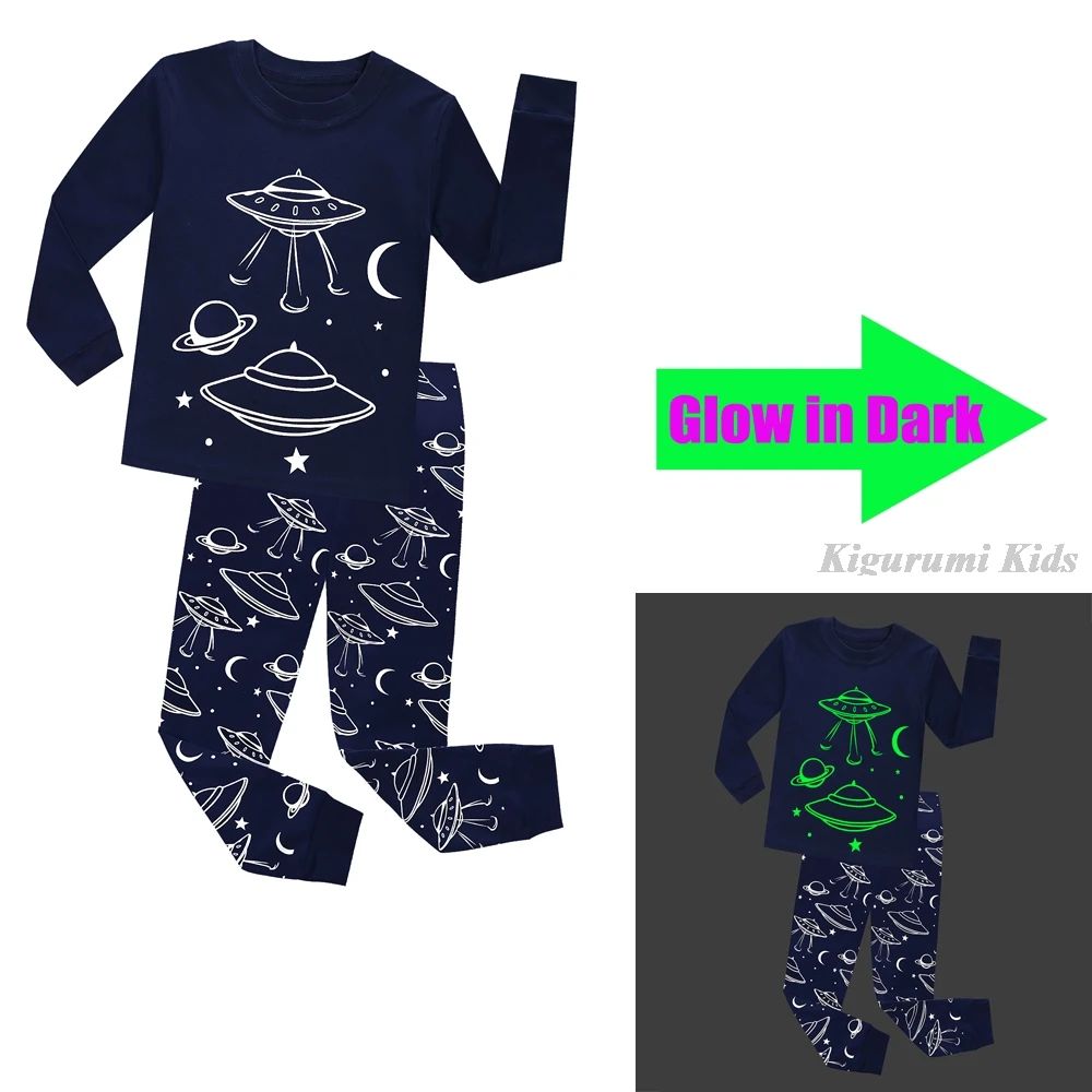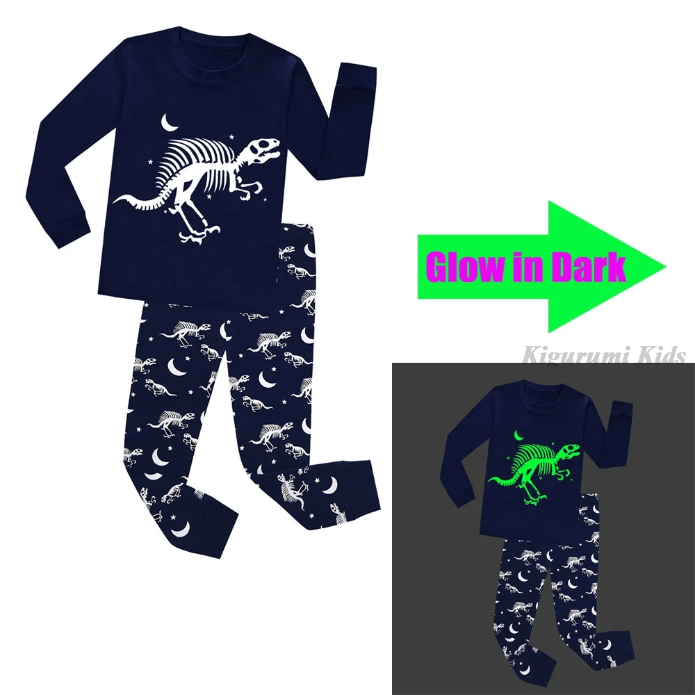 Светящиеся в темноте, пижамы динозавр; Пижамные комплекты; Детская одежда для 100% хлопок световой костюмы Пижама для мальчика и девочек, одежда для сна с длинными рукавами, одежда для сна