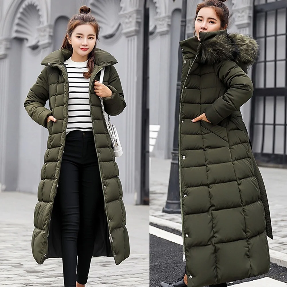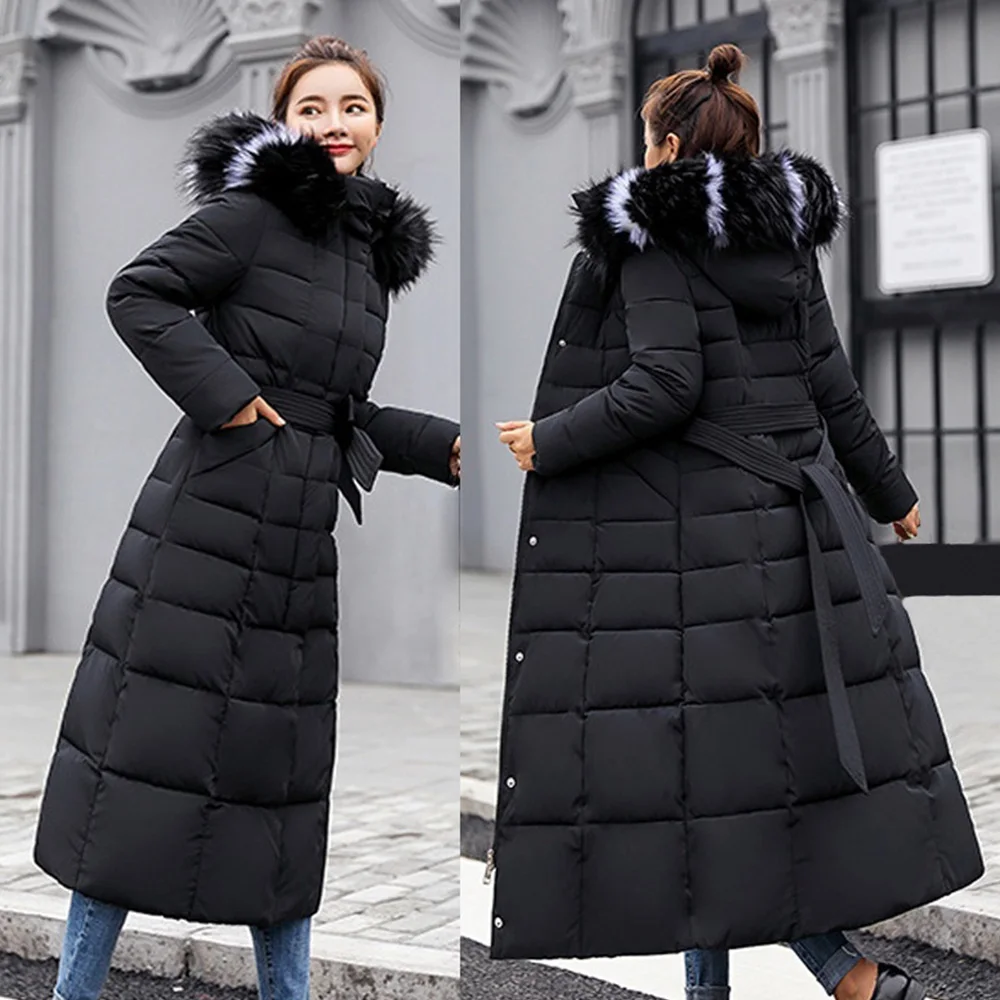 Модное зимнее пальто, женские куртки, толстые хлопковые парки с большим меховым поясом и капюшоном, длинные хлопковые пальто, теплая ветровка, Женская облегающая верхняя одежда