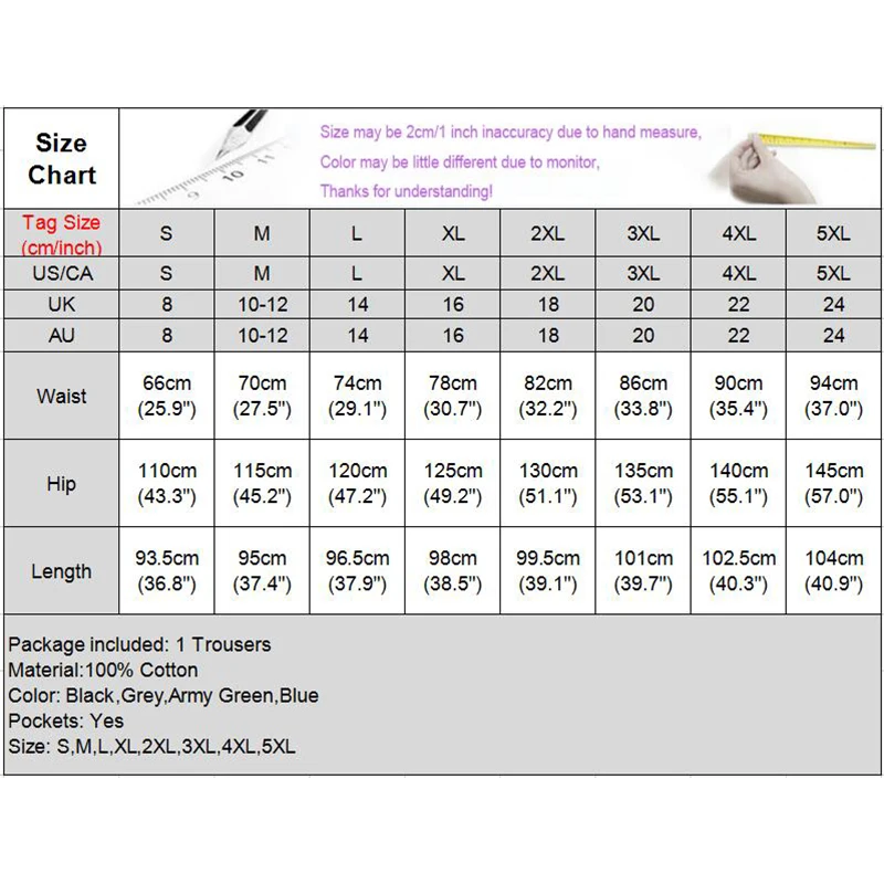 Посылка: 1 брюкиМатериал: 100% хлопокЦвет: черный, серый, армейский зеленый, синийКарманы: ДаРазмер: S,M,L,XL,2XL ,,,Узор: СплошнойДлина: до щиколоткиОсобенности: карманСтиль: ПовседневныйСезон: 4 сезонаПовод вечерние, праздник, уличная одежда