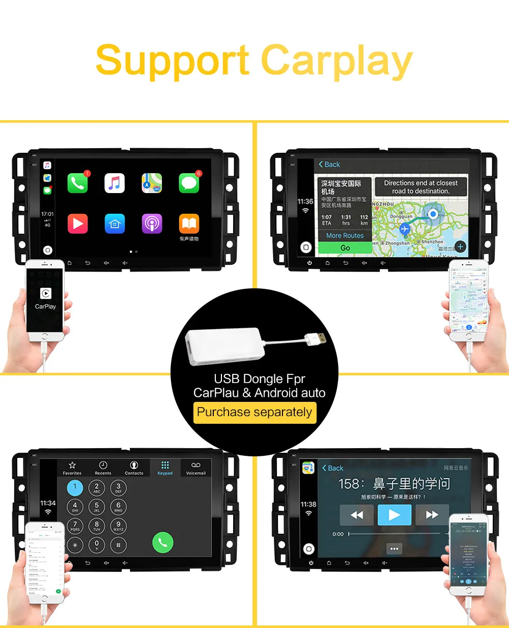 Эта функция Carplay может поддерживать продукт carplay USB (IPhone). И он поддерживает Голосовое управление оригинального автомобиля, Оригинальный сенсорный экран автомобиля. (Если вам нужна дополнительная функция, пожалуйста, купите ключ apple carPlay)