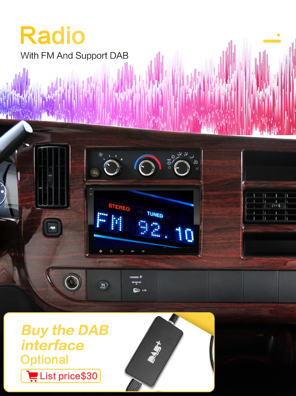 DAB: по сравнению с обычным аналоговым радио, DAB высококачественные звуковые эффекты и передача без шума, которые увеличивают радиосвязь вокруг большинства европейских, но нужно купить интерфейс DAB. Fm-радио делает расслабляющую автомобильную поездку.