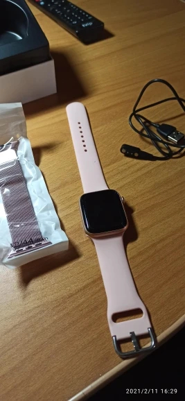 Часы как на фото. Очень быстрая доставка, продавец отправил посылку 21.01.2021, а получила я ее 03.02.2020. Все целое, зарядка заряжает. Пока еще не подключала. После подключения дополню отзыв. Спасибо.
