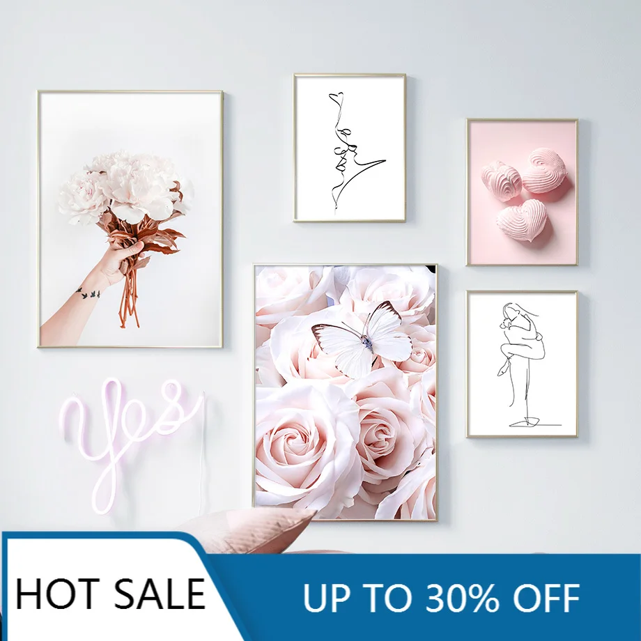 Рождественская Картина на холсте розовая роза бабочка цветок лебедь линия искусство скандинавские плакаты и принты настенные картины для декора гостиной