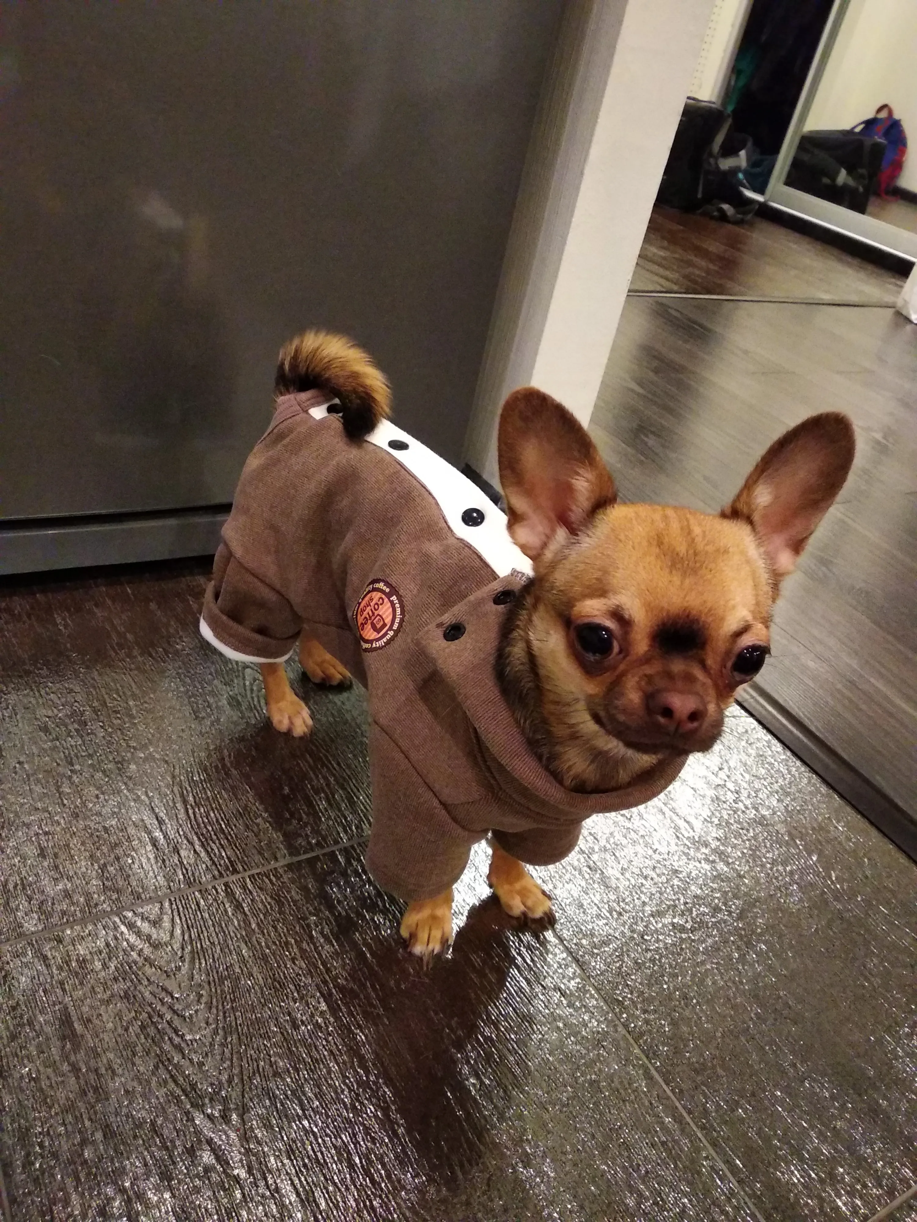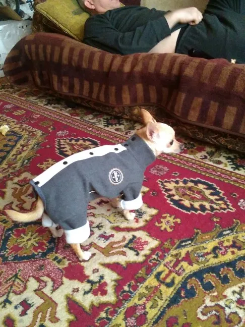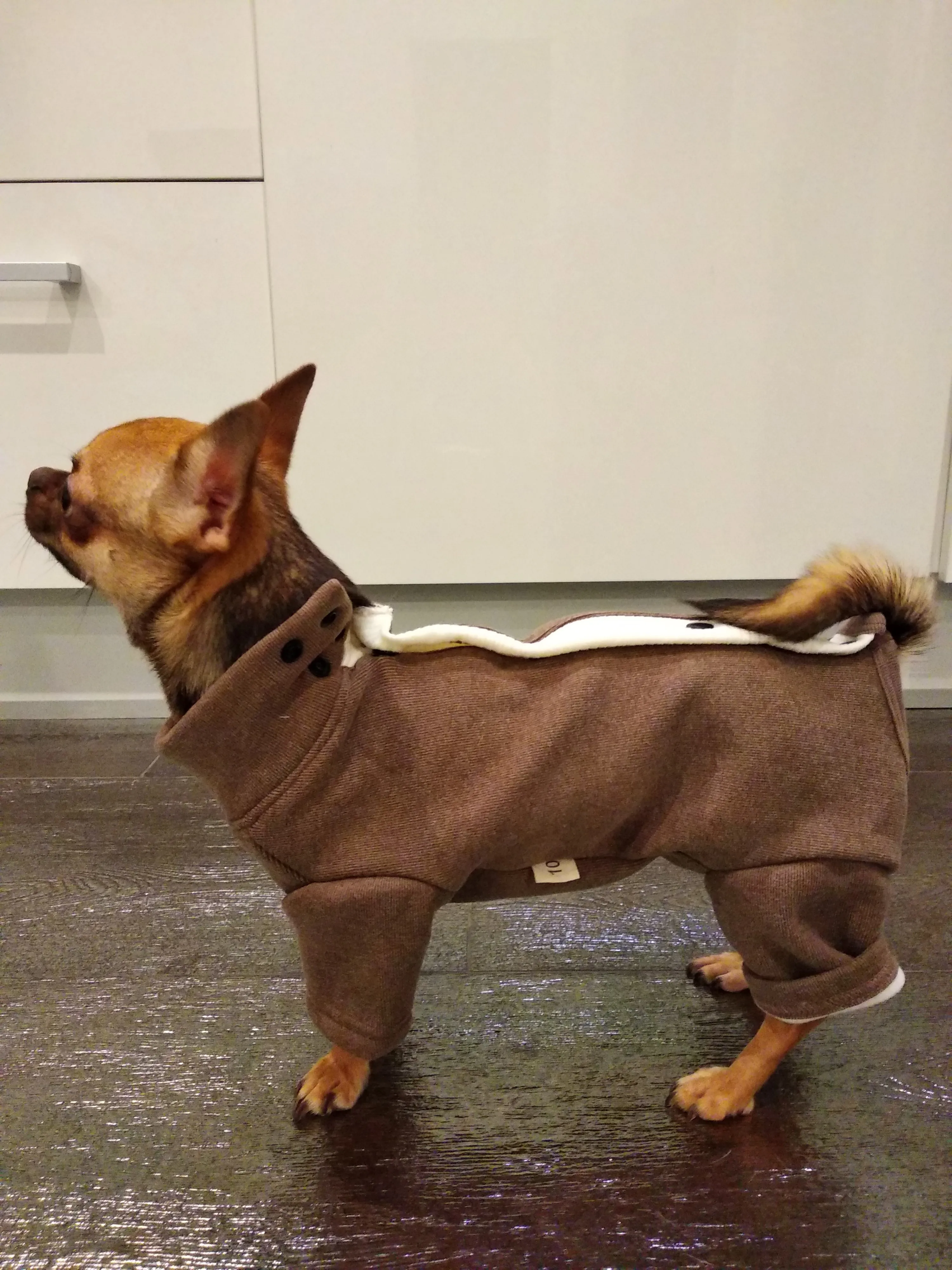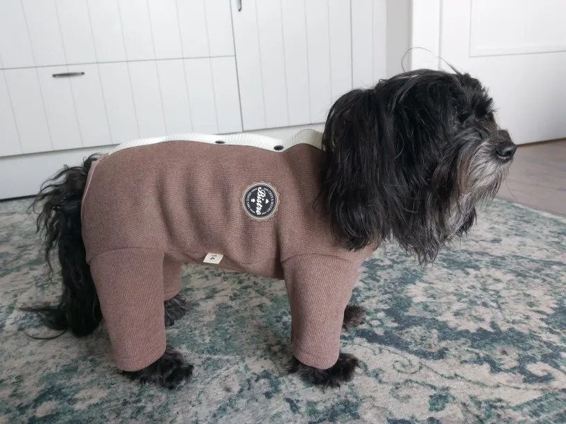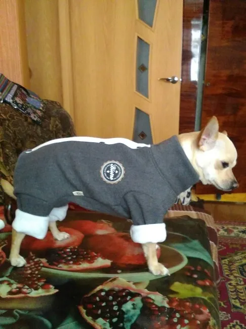 Классный комбез. Очень мягкая, тёплая ткань. 14 размер отлично подошёл на карлика-пуделя (30см в холке)