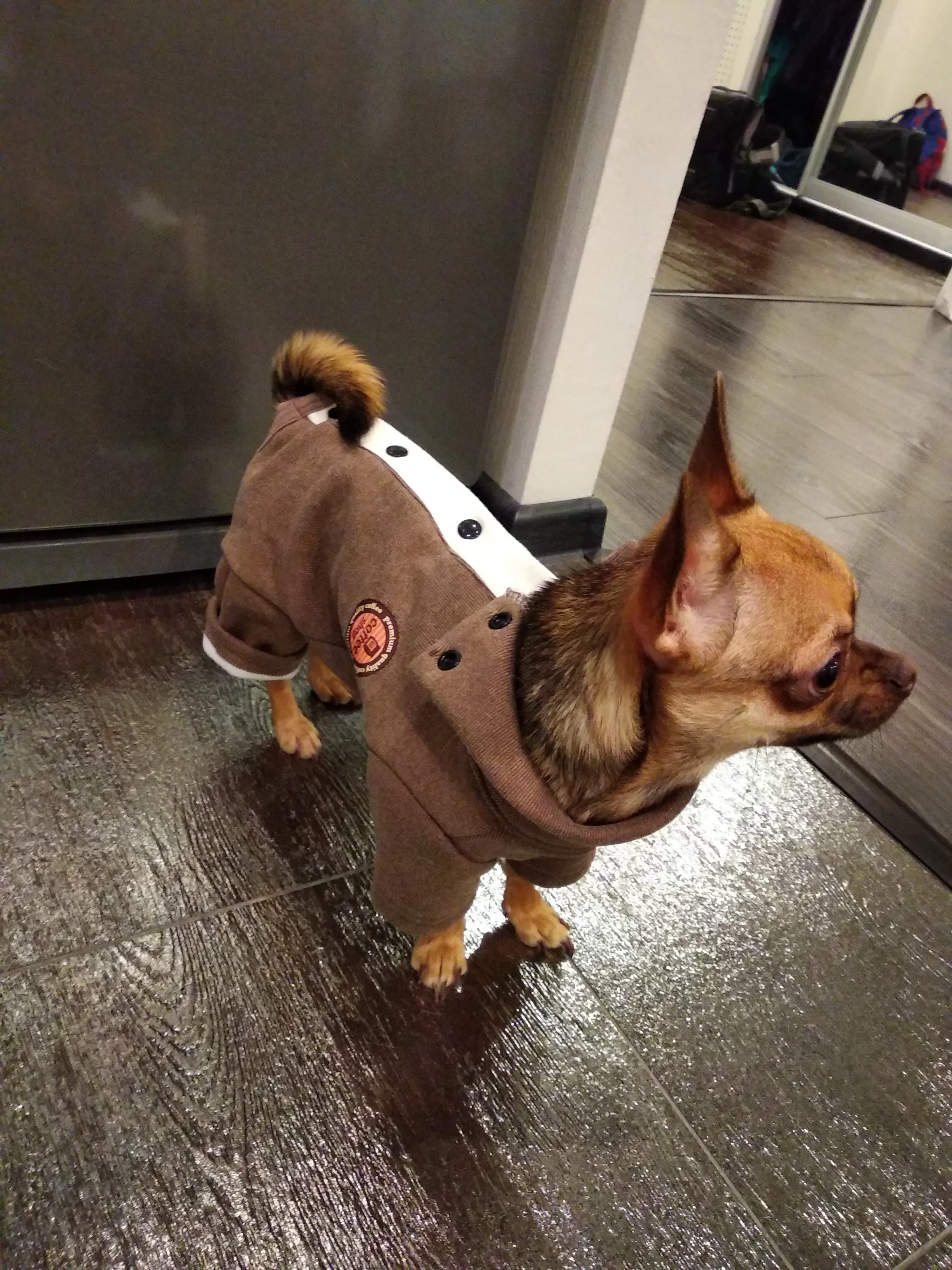 Комбинезон отличного качества! Очень мягкий и тепленький. Цвет в реале немного темнее, чем на фото. На чихуа 2400 кг (худенькая, длина спины 27-28 см) подошел р.10 (ориентировалась на размерную таблицу, т.к. небыло ни одного отзыва). В объеме (талии) немного широк, но не критично (зато не жмет и не сковывает движения), передние штанины сели хорошо, а задние длинноваты (поправимо, подвернули - это проблема всех комбинезонов у нас, т.к. ножки худенькие и короткие). Собака в комбинезоне передвигается свободно, нужные места открыты)) . До Омска приехал за 3 недели. Продавца и товар рекомендую!!! Закажу еще в другом цвете. Спасибо за качественный товар!