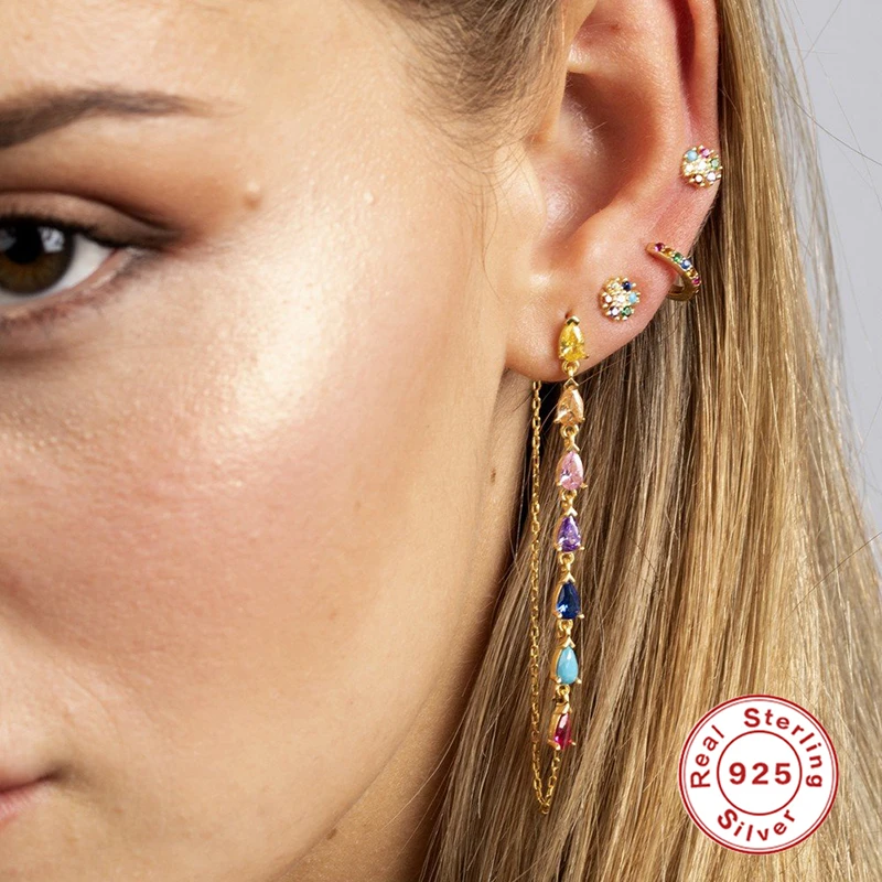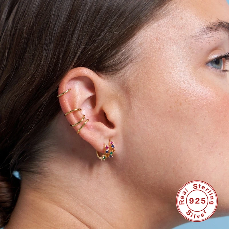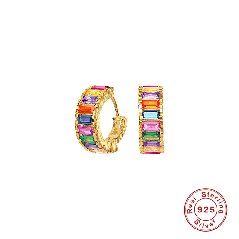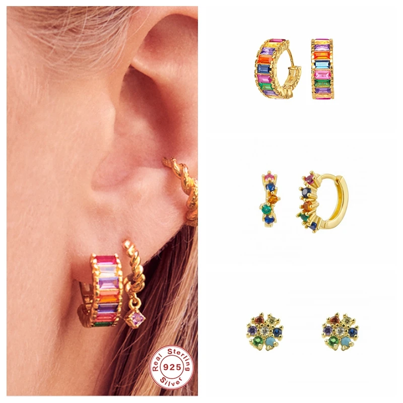 100% Стерлинговое Серебро S925, женские серьги, блестящий Радужный кристалл, Huggies, серьга в виде кольца для девочек, влюбленных, ювелирные изделия в Корейском стиле