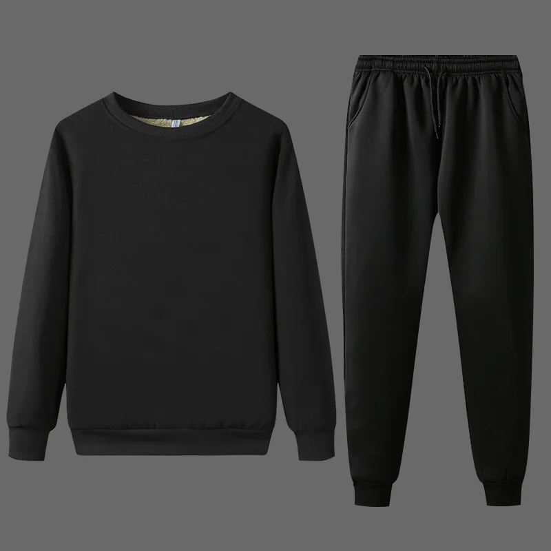 Мужской флисовый костюм с круглым вырезом, черный повседневный спортивный костюм с флисовой толстовкой и черными штанами, пуловер для мужчин на осень