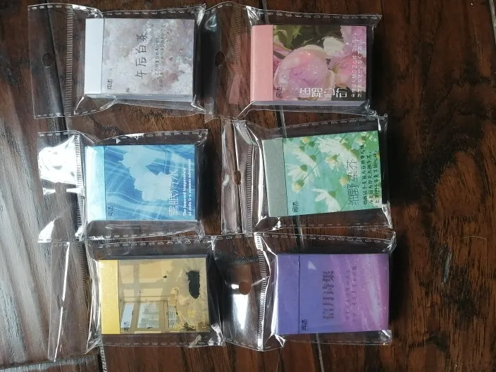 наклейки размером со спичечный коробок, печать изображений не очень хорошего качества, но бумага - просто ужас. эти наклейки напечатаны на папиросной полупрозрачной самоклейке, подложка раза в три толще самой наклейки. непригодны для заклеивания ноутов, телефонов и мебели, так как просвечивают, ещё и пятнами