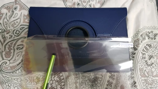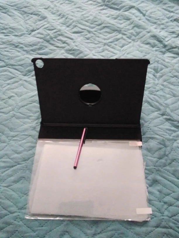 Чехол пришёл в хорошем состоянии. Доставлялся 16 дней (довольно быстро). К чехлу положили стилус и защитную плёнку. Правда, вращательный аппарат из пластмассы, не думаю что на долго его хватит. Чехол идеально подошёл по размеру планшета.)