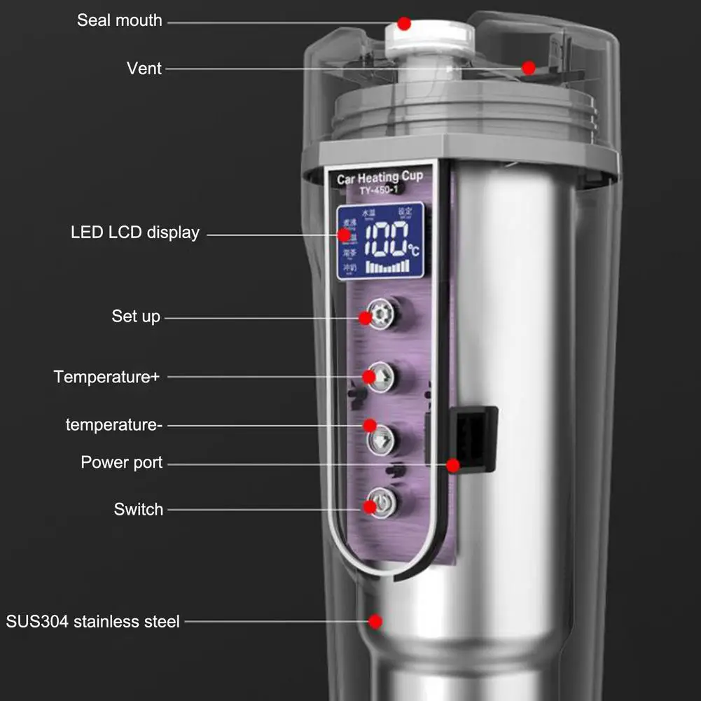 Автомобильная электрическая чашка с подогревом, 450 мл, 12 В24 В, чашка для воды из нержавеющей стали, ЖК-дисплей, чайник с подогревом температуры, чашка для кофе, чая, молока