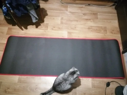 Хорошее качество, материал плотный, пол сквозь него не чувствуется. Коврик плотно прилегает к полу и не скользит. С одной стороны ровный, с другой в рубчик. Если попадают крошки, остаётся небольшой след, пришёл то ли с царапинками, то ли с небольшим замятием, но мне это совершенно не критично. Этот цвет достался мне ща 320р примерно, это очень дёшево, я довольна. Но и за полную стоимость, он существенно лучше тех ковриков, что я видела в магазине или в фитнес клубах. С доставкой из России получила за неделю примерно, в комплекте резинки для фиксации в рулоне и чехол для переноски, очень удобно