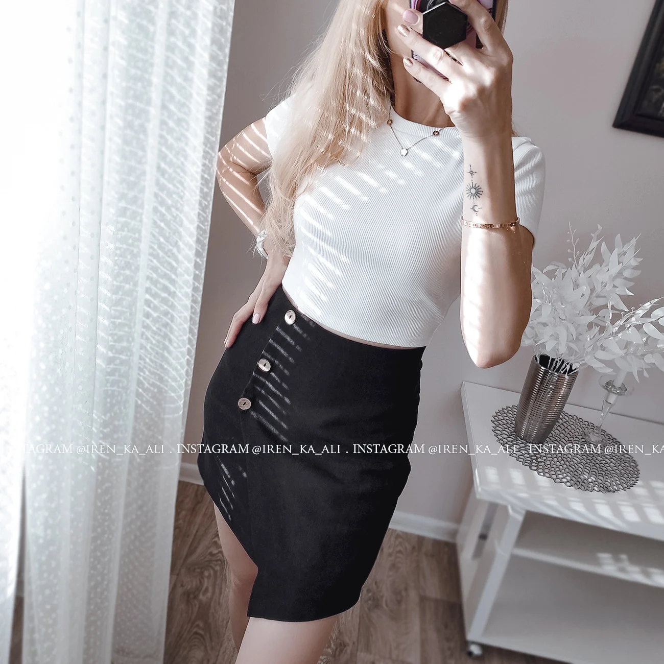 юбка не имеет подкладки. Тут один слой материала и всё. На 90-65-90 и рост 175 см размер S сел хорошо, но плотно - запаса нет. нравится, что она не перекручивается и нигде не жмет. По росту длина впритык, довольно коротко :))) Лучше сядет на рост 165-168 см. ОТ - 66 см / ОБ- 93 см / Длина - 40 см Юбка А-силуэта, спереди имеет имитацию запАха, который декорирован пуговицами. Застегивается юбка сзади на скрытую молнию. Она вшита аккуратно и работает хорошо. Пояса как такового нет. Материал не толстый, скорее тонкий, но плотный. Носить можно как зимой, так и летом, очень удобно! Он не тянется, не просвечивает, не мнется. На первый взгляд напоминает тонкий вельвет. По факту это 100 % ПЭ. Исполнение качественное.