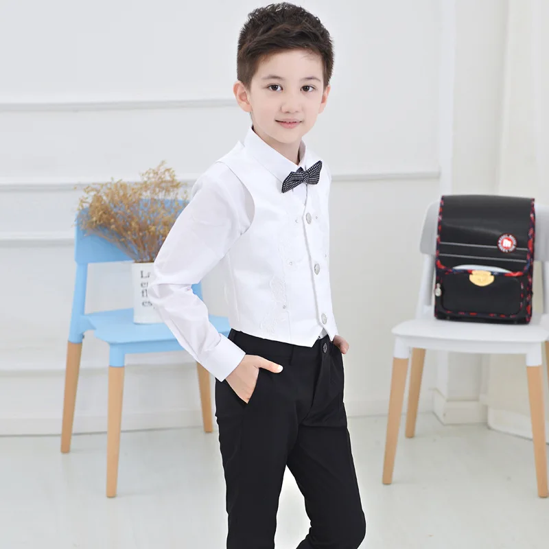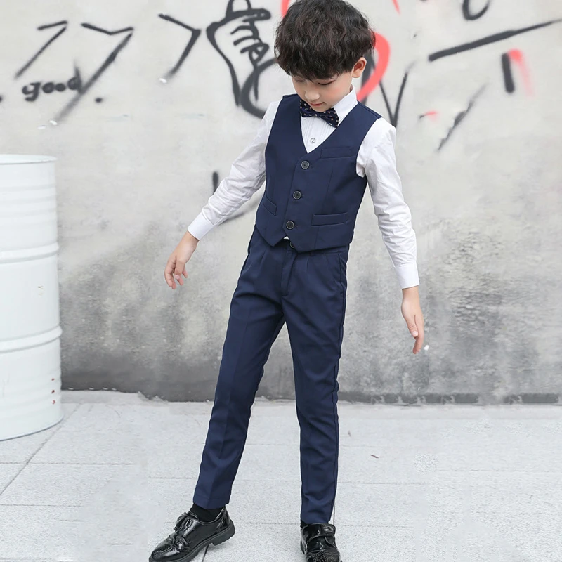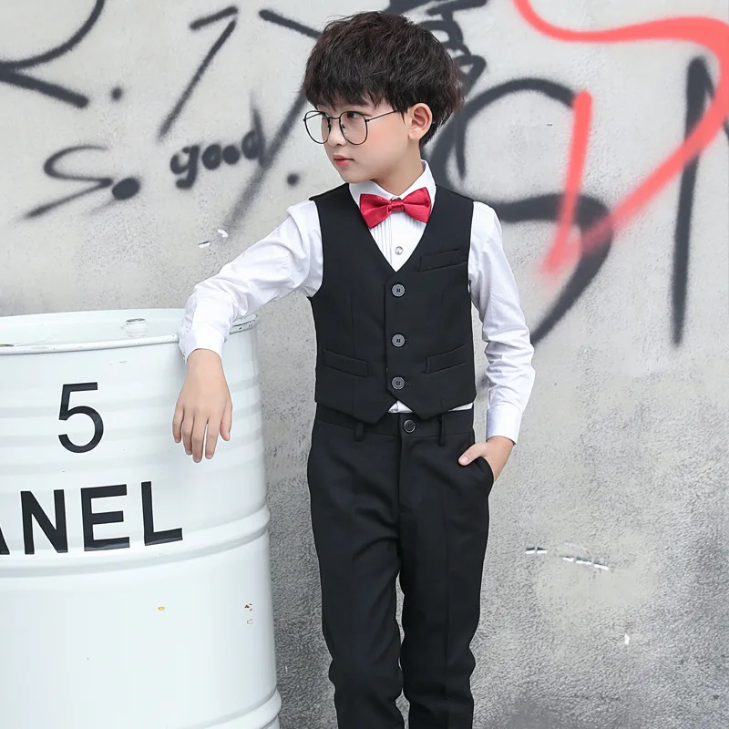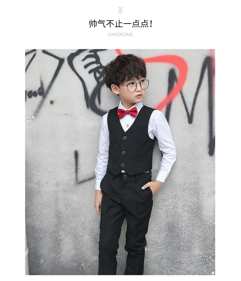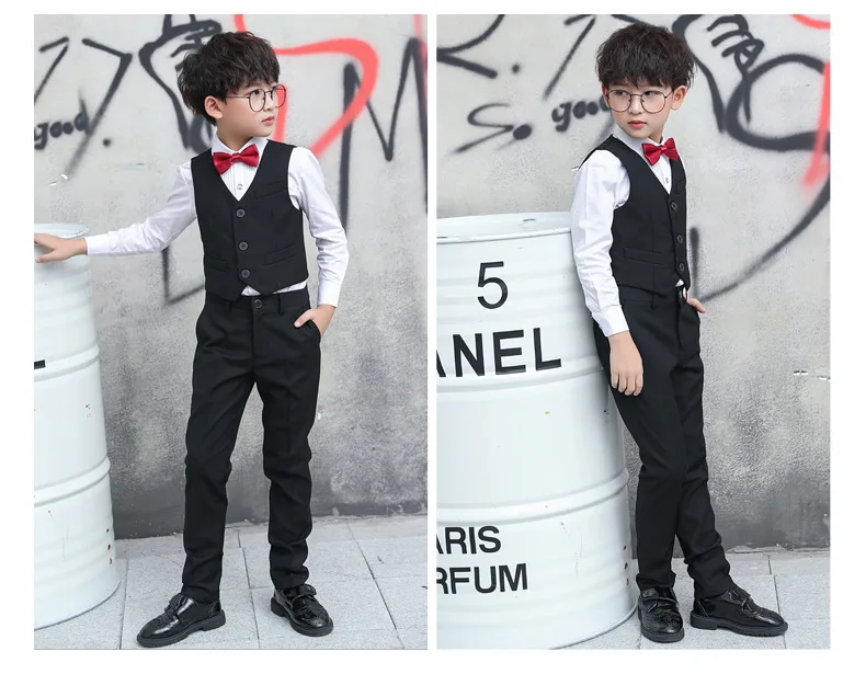 Новинка 2021, весенний Детский костюм из 4 предметов, одежда для мальчиков-подростков на осень, хлопковые комплекты одежды для детей, жилет, рубашки, брюки, комплект для мальчиков с бантом