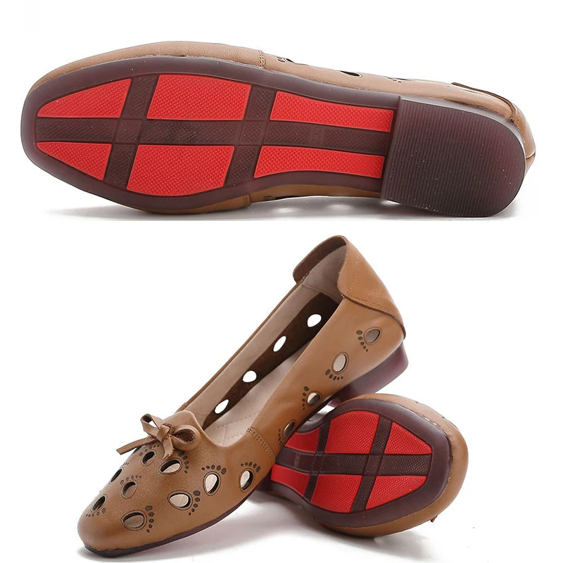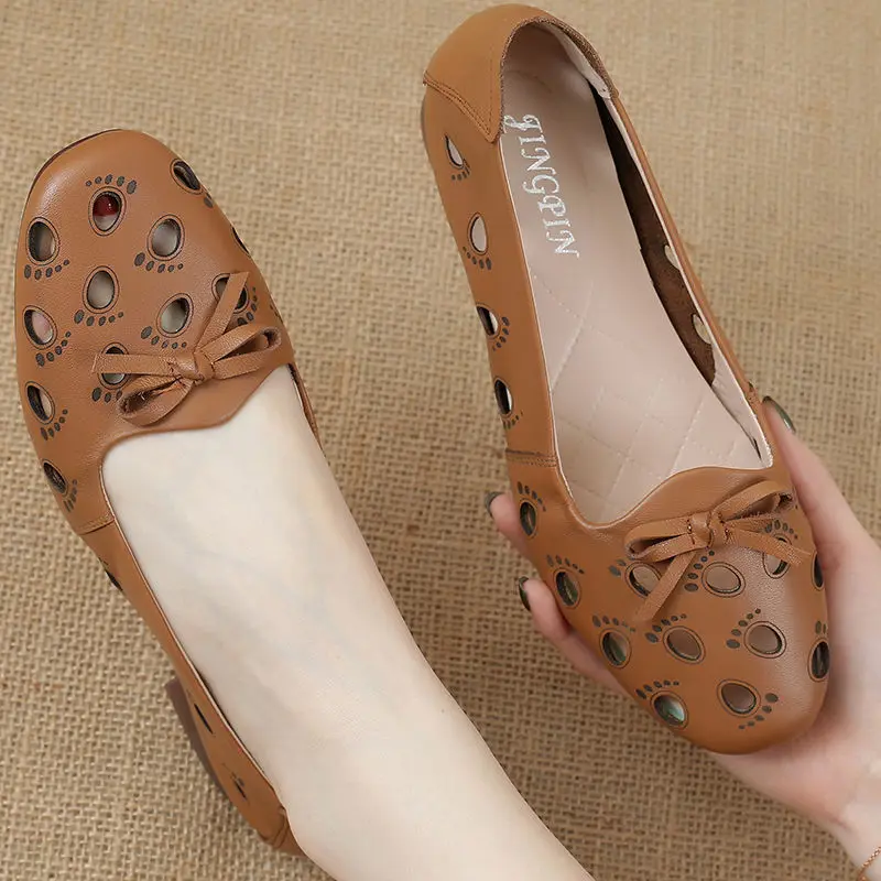 Женские туфли из мягкой натуральной кожи, с острым носком, на плоской подошве, дышащие туфли с вырезами и бантом, большие размеры 35-43, для лета, 2021
