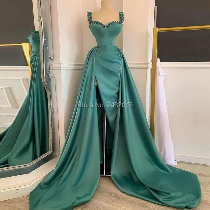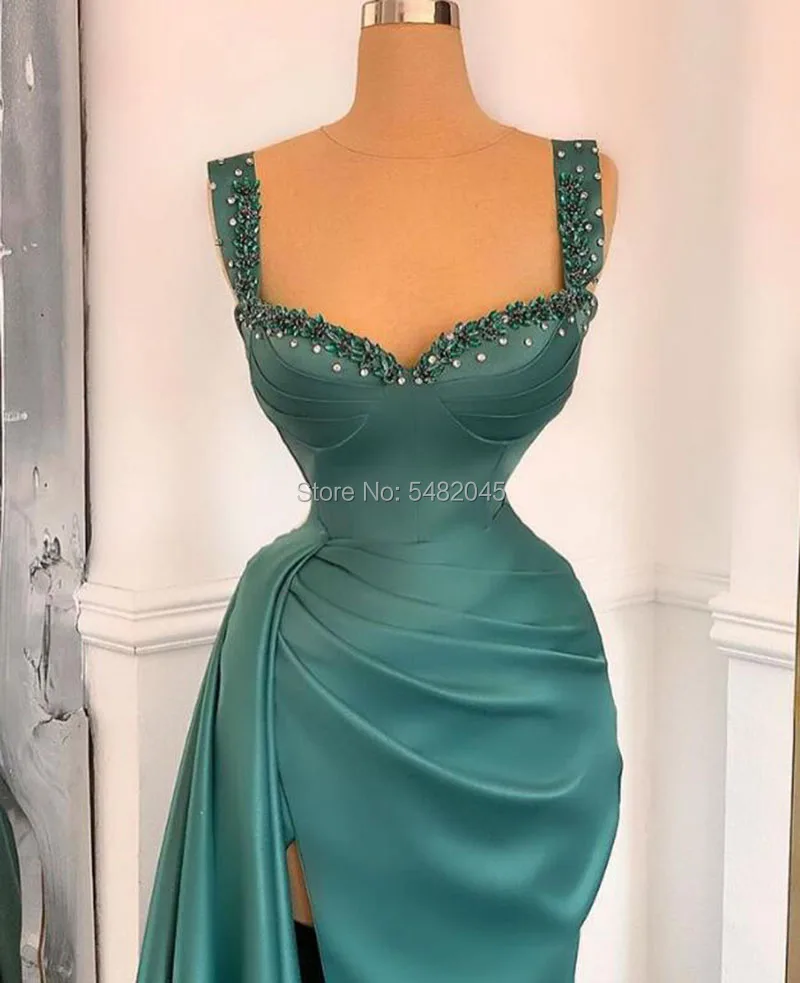 Вечернее платье LORIE, зеленое, с круглым вырезом, украшенное бисером, стразы по бокам, атласное, арабское, для выпускного, с длинным шлейфом