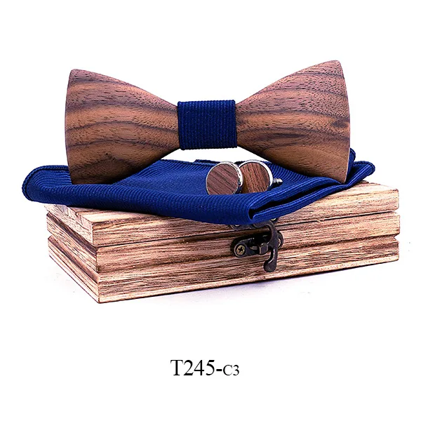 Paisley 3D Walnut Wooden Bow Tie Navy blue Plaid Handkerchief Cuffl...