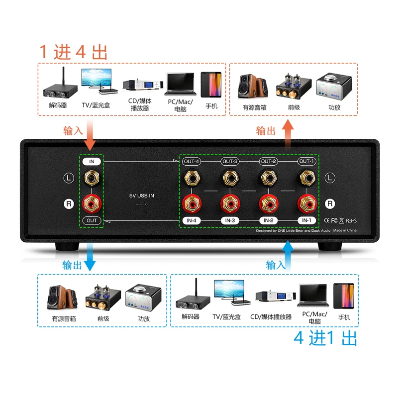 Все входные и выходные интерфейсы-это медные и длинные Позолоченные RCA-интерфейсы, обладающие отличными электрическими характеристиками, большой площадью контакта и минимальными потерями сигнала. Хорошие материалы могут обеспечить хорошее качество звука.