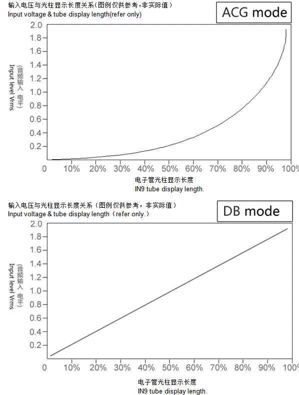 1. В режиме ACG измеритель VU приводится в движение с помощью экспоненциального алгоритма сжатия, что означает, что связь между входным объемом и поворотом стрелки не пропорциональна. Из графика отношений видно, что при низком входном объеме указатель качается более широко. При постепенном увеличении объема амплитуда поворота Стрелки постепенно уменьшается. В этом режиме пользователи могут использовать измеритель VU в большем диапазоне аудиовхода без регулировки коэффициента усиления, и в то же время получить хороший эффект отображения. Когда указатель прыгает вместе с музыкой, даже если вход громкости слишком мал, указатель будет прыгать, даже если вход громкости большой, он не достигнет максимального раскачивания. Рекомендуется регулировать усиление, чтобы стрелка качалась максимально близко к 0dB.