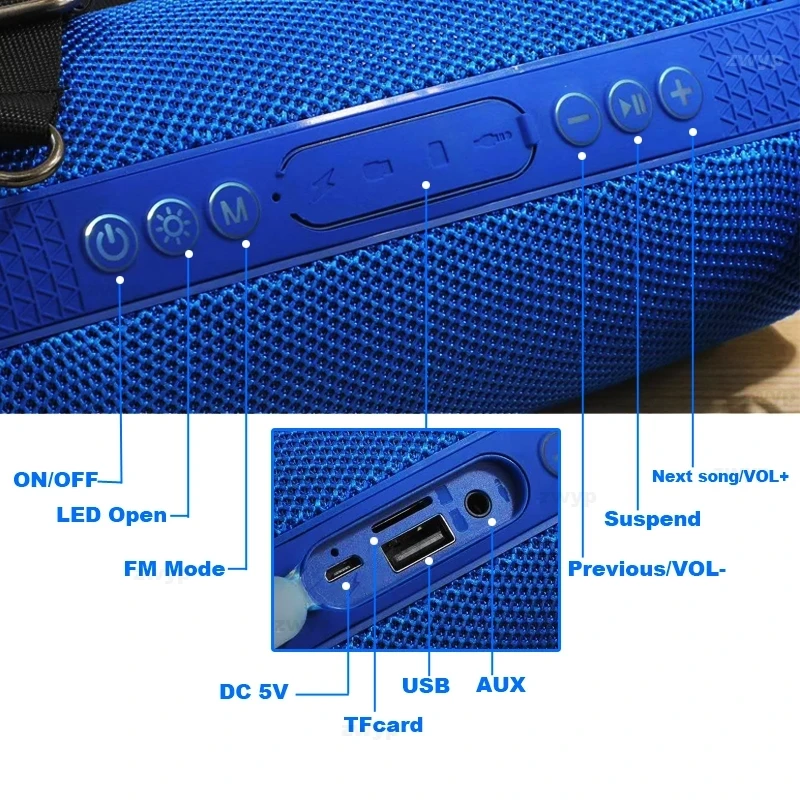 Параметры продукта: Версия Bluetooth: V5.0 Диапазон беспроводной передачи: 10 м Емкость аккумулятора: 2400 мАч Характеристики динамика: 52 мм * 2 Мощность динамика: 4Ω/ 10 Вт * 2 Частотная характеристика: 100 Гц-20 кГц Размер изделия: 194,4*81 мм * 82 мм Напряжение зарядки: 5 В/2 А Характеристика: 1. Используйте улучшенный чип декодирования аудио Bluetooth для поддержки всех подключений устройств Bluetooth; 2. Поддержка fm-радио, вы можете искать радиостанции непосредственно в области прослушивания; 3. Тон мягкий, чистый, динамичный, с различными уровнями. 4. Непосредственно считывает tf-карту и u-диск; 5. Расстояние приема Bluetooth может быть до 10 метров 6. Поддержка аудиовхода в линии и предоставление вам функции динамика компьютера. Может быть непосредственно подключен к мобильным телефонам/планшетам/в паре с Bluetooth для воспроизведения музыки;