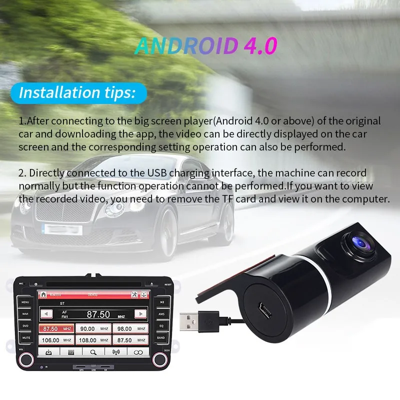1.USB напрямую подключен к радио. Откройте папку, найдите Автомобильный видеорегистратор USB2. Нажмите на «DVR APK» для установки3. Установочный дисплей4. Установка завершена, откройте Apk Внимание:1. Многие отзывы покупателей о том, что обновление APK приведет к неправильному использованию некоторых моделей. Помните, что вам не нужно обновлять APK.2. Монитор или радио не требуется для работы, просто подключите usb-порт для питания видеорегистратора.3. Видео и изображения хранятся в tf-карте, поэтому требуется карта TF. Вы можете вставить tf-карту в свой мобильный телефон или открыть видео на вашем компьютере.