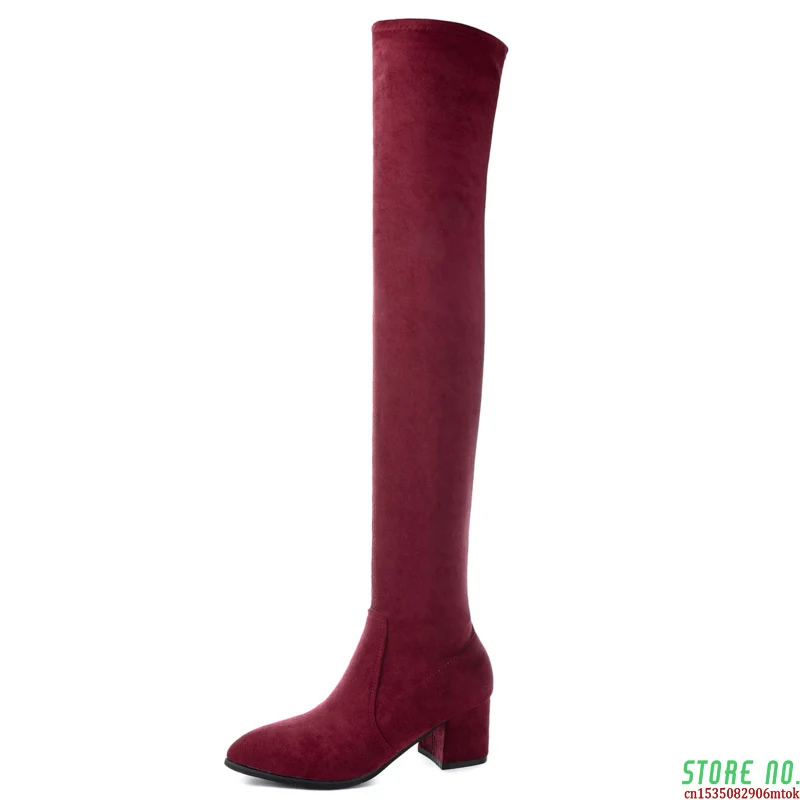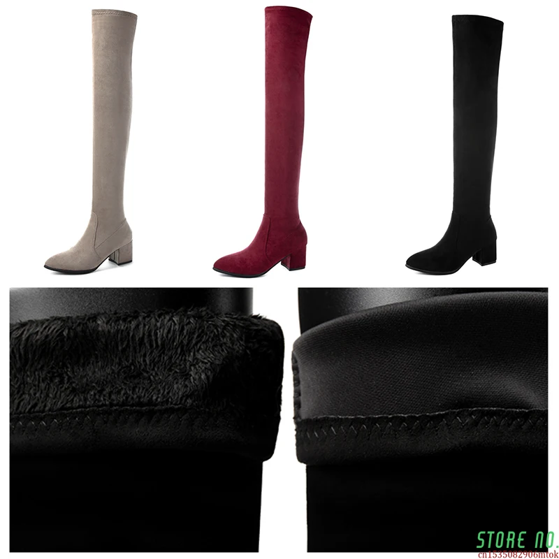 Новинка, зимние женские Сапоги выше колена, женские модные эластичные сапоги, красные, черные сапоги на высоком каблуке, сапоги с Плюшевым Мехом, женская обувь