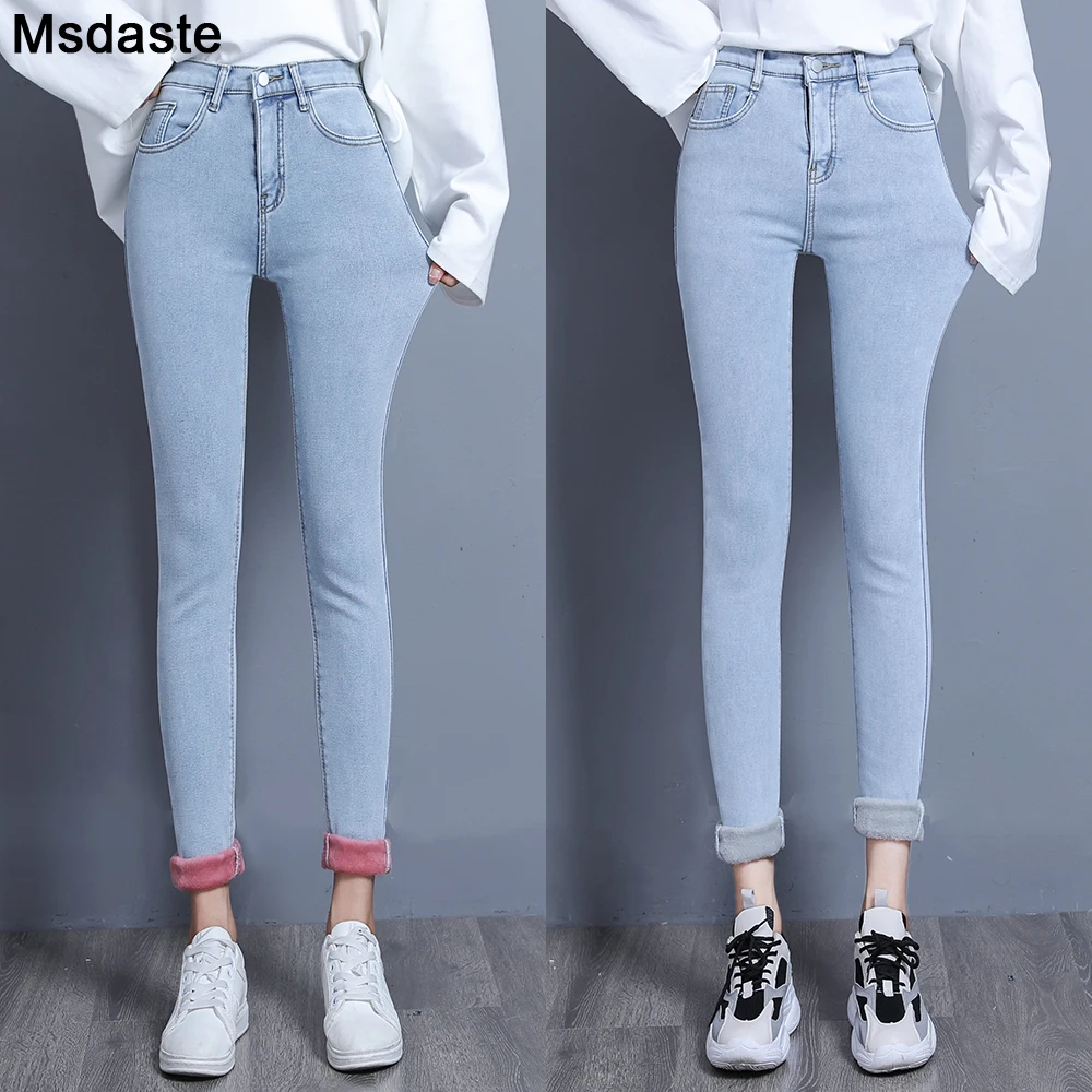 Зимние джинсы для женщин, узкие эластичные повседневные уличные джинсы с высокой талией, флисовые узкие теплые джинсы-карандаш с вельветом