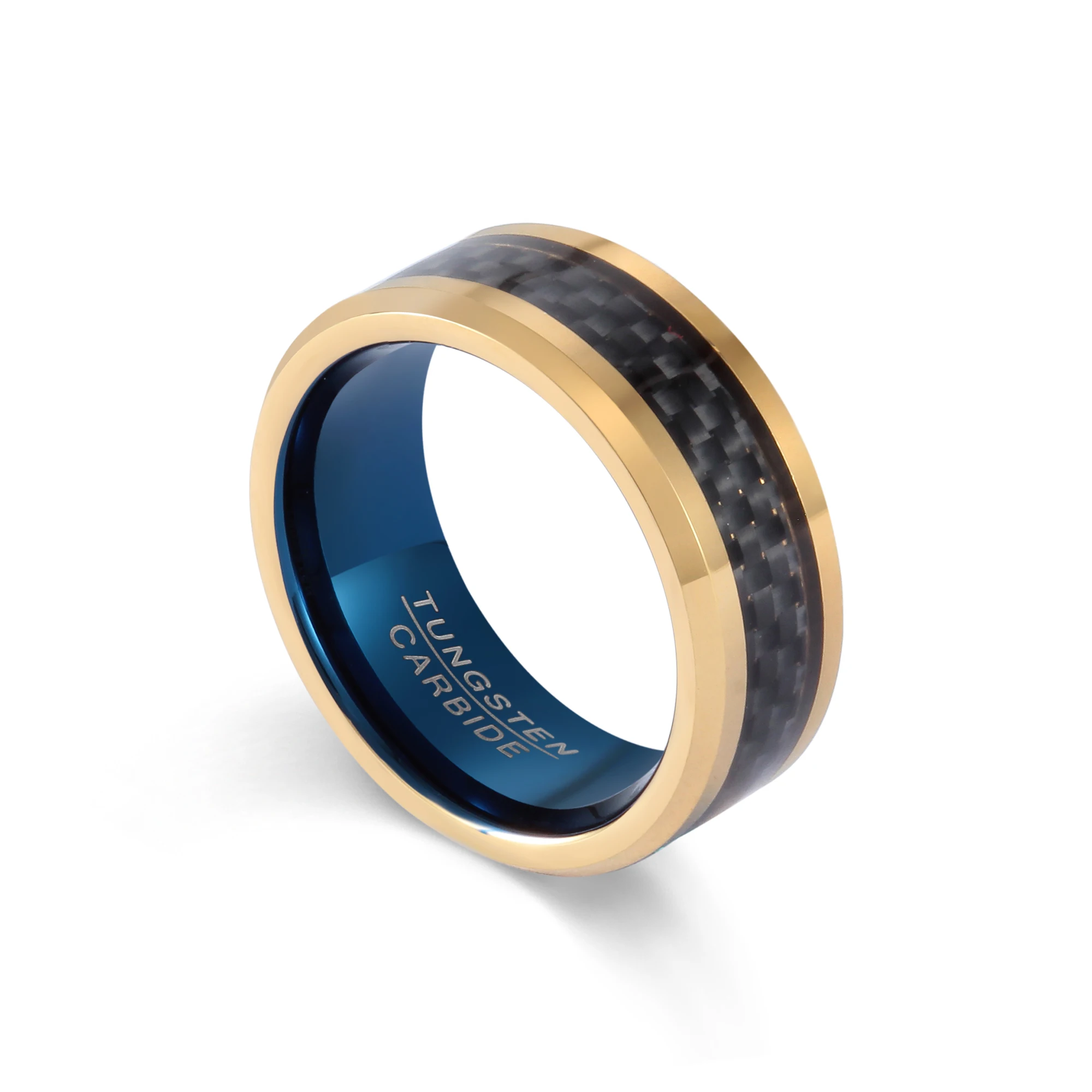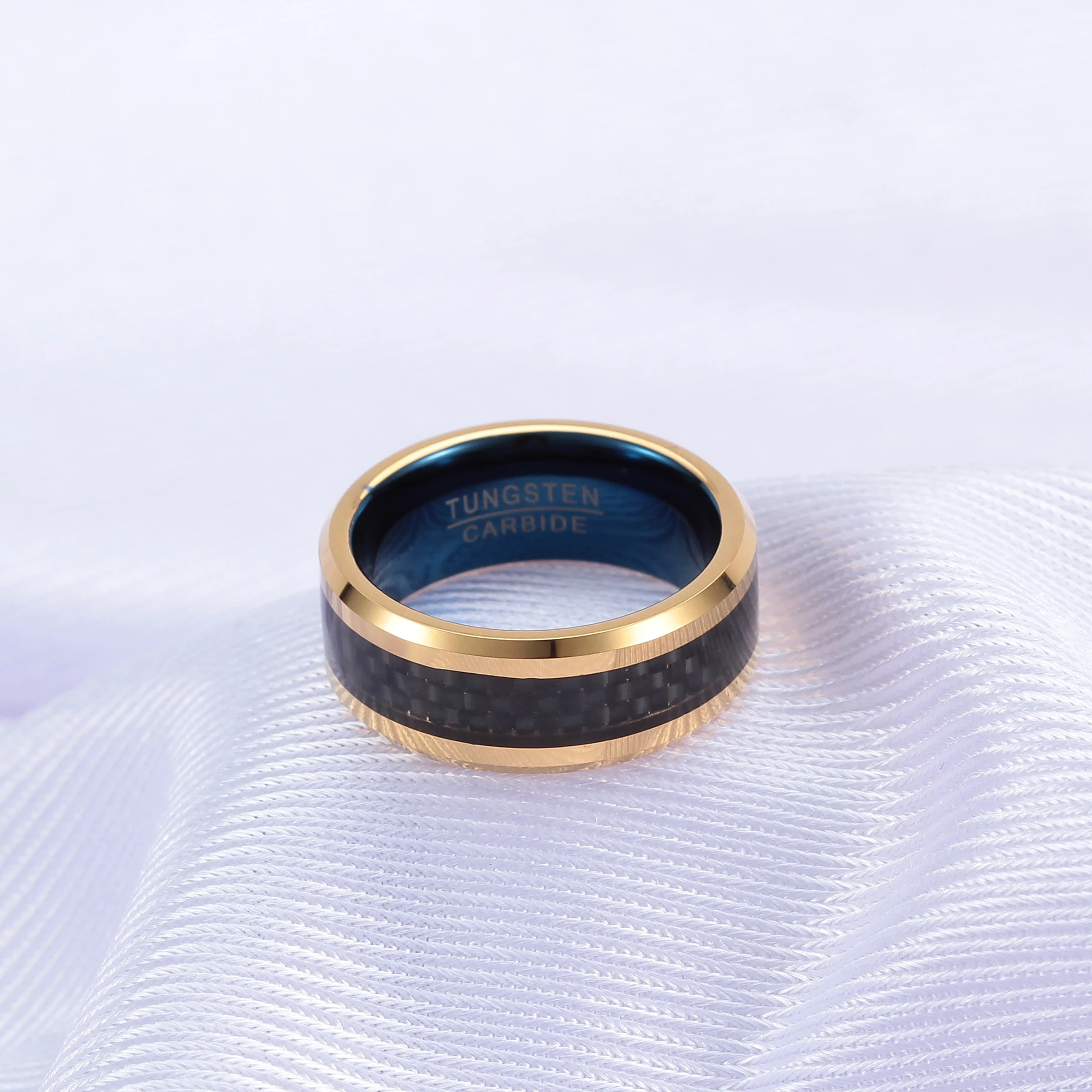 Материал: Вольфрам Высокая полировка и скошенные края Ширина: 8 мм Цвет: Золотой и синий Подкладка: черное углеродное волокно Доступные размеры s: размер 6-15, включая половину размера s. Устойчивость к царапинам Водонепроницаемый Вольфрамовые кольца для мужчин, черный углеродное волокно, инкрустация, Свадебная лента, скошенные края, удобная посадка