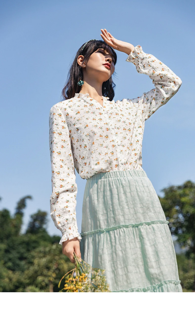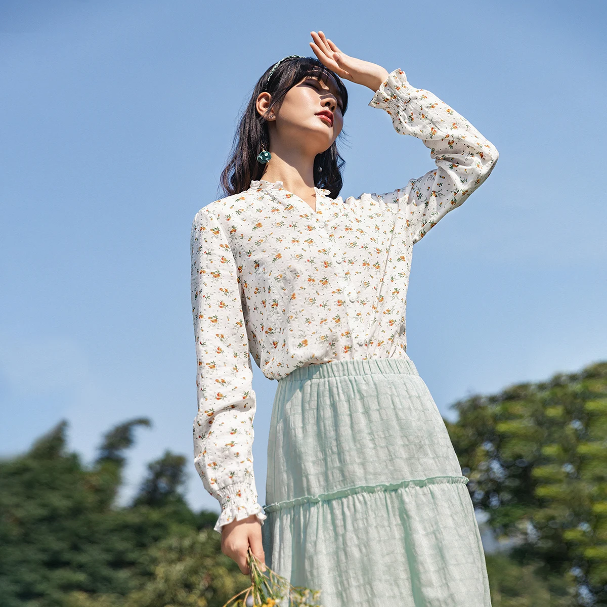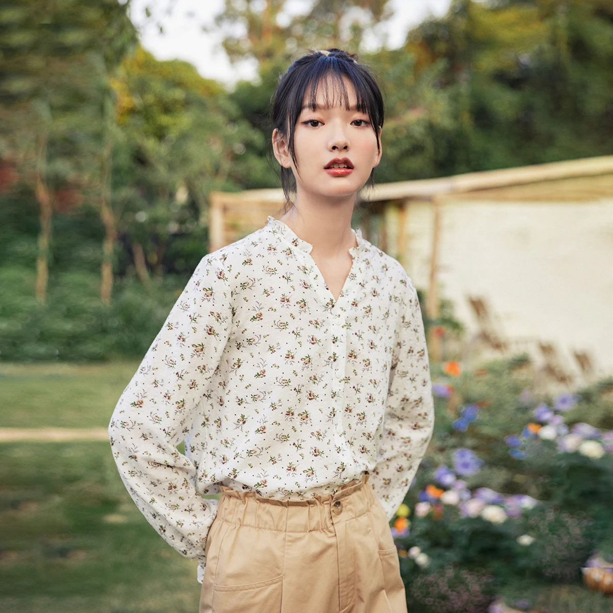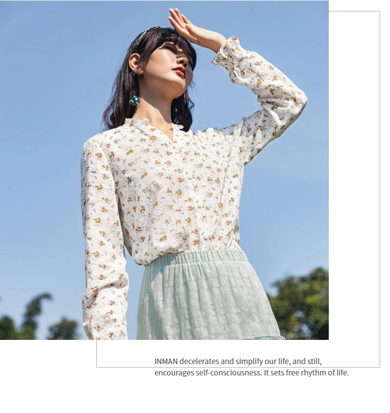 INMAN 2021 весна осень Новое поступление Женская свежая Agaric на шнуровке рукава тонкая Цветочная рубашка с длинным рукавом Seersucker