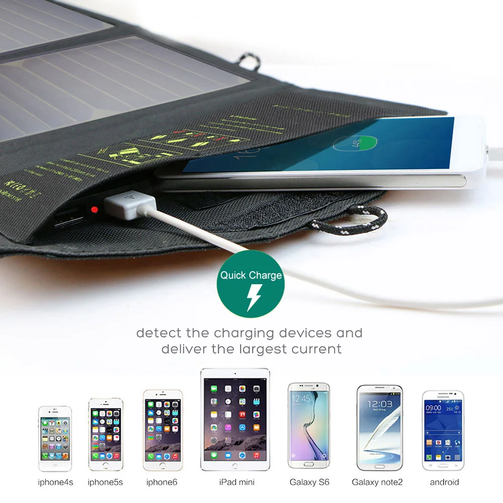 ▶【Высокоэффективный солнечный элемент премиум-класса SUNPOWER 】 солнечный элемент премиум-класса является лучшим из серии SUNPOWER, высокой эффективностью до 25% и длительным сроком службы. Он имеет лучшую намного производительность, чем другие обычные моносолнечные элементы на рынке. ▶【Два выходных порта USB 】 в него встроены 2 выходных порта USB, которые могут заряжать 2 устройства одновременно. Вы можете заряжать 2 мобильных телефона или 1 мобильный телефон одновременно, что поможет вам сэкономить много времени. ▶【Передовая технология интеллектуальной зарядки】 она может обновляться при зарядке различных устройств и обеспечивать максимальную мощность для устройств быстрой зарядки. Интеллектуальная микросхема автоматически отключит зарядку, чтобы предотвратить перезарядку. ▶【Светильник и портативный】 вес очень светильник, складная конструкция позволяет легко носить с собой для активного отдыха, Бесплатные Подарочные карабины помогут вам носить его на рюкзаке, чтобы освободить руки. ▶【Широко совместимая зарядка многих устройства】 он может заряжать не только различные мобильные телефоны, такие как iPhone iPad Tablet Samsung Huawei Xiaomi OnePlus OPPO Vivo Sony HTC и т. д., но также может заряжать внешний аккумулятор телефона, наушники, наушники, динамик Bluetooth и другие устройства.