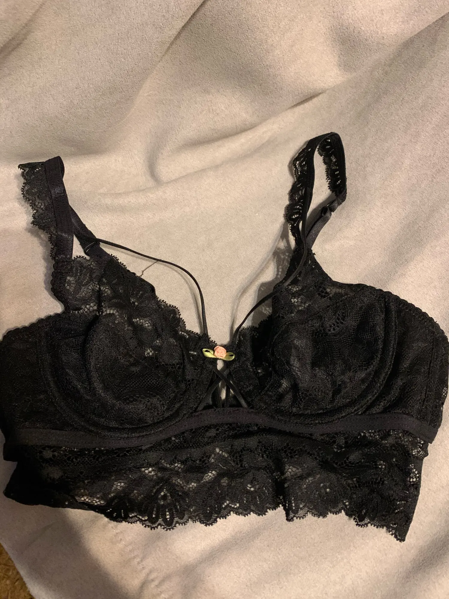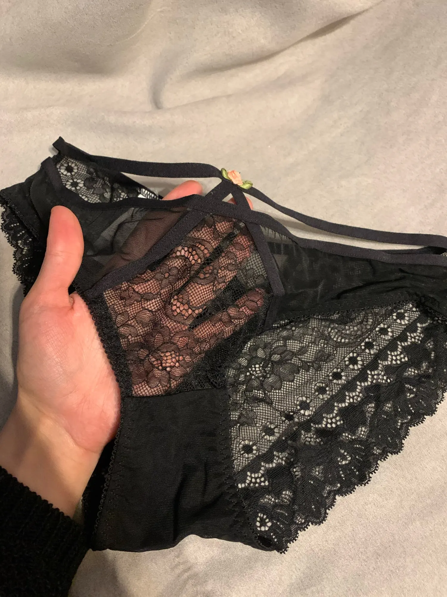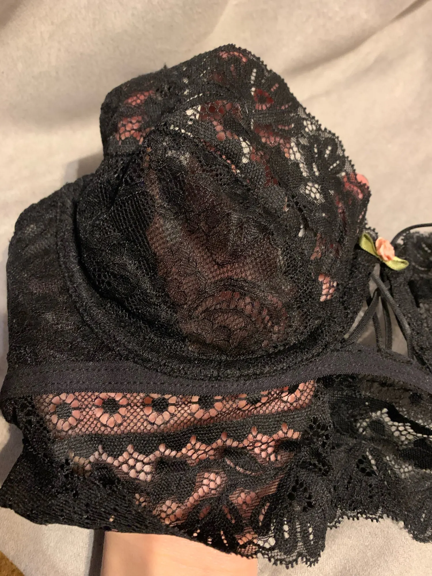 Я в восторге. Комплект просто идеальный, особенно после того, как я отрезала те всратые розочки. Ношу чашку D, боялась, что будет маломерить, но он идеально сел, лиф очень мягкий, нитки не торчат, всё сшито качественно и смотрится восхитительно. Трусики пришли ХL, с высокой посадкой, на от 63 об 92 даже великоваты. Однозначно стоит своих денег, буду брать ещё в другом цвете