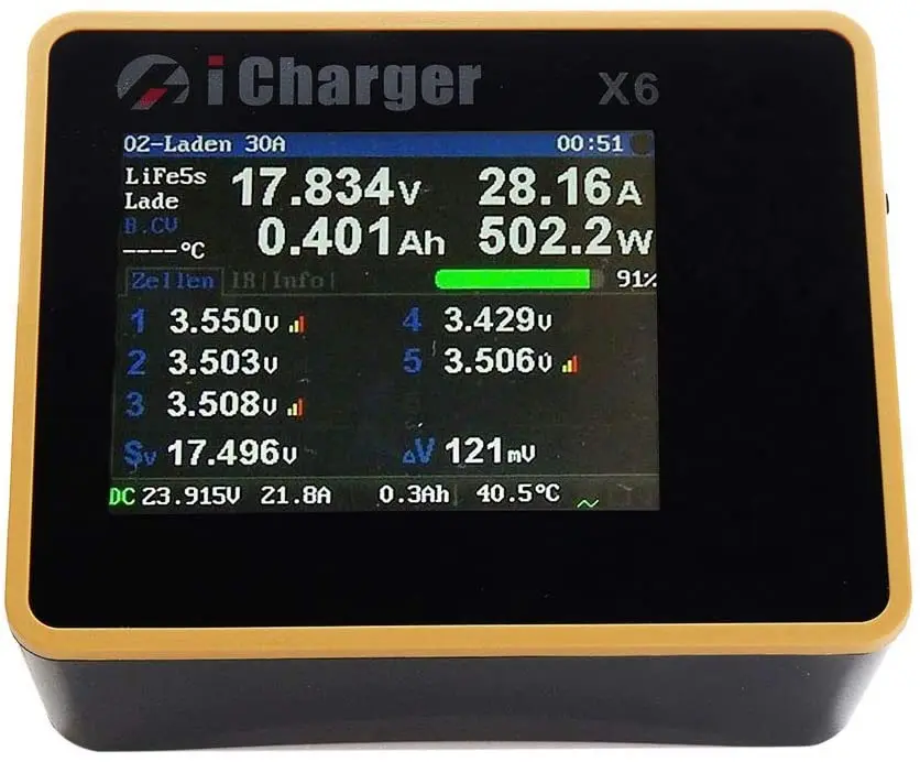 -X6 поддерживает батареи 6s LiPo, Lilo, LiFe, LiHV, LTO и NiZn с максимальным балансовым током 2A и принимает уникальный расчет баланса внутренней коррекции сопротивления. Поддерживает 1-20s NiMH/NiCd батареи и 1-12s Pb батареи.