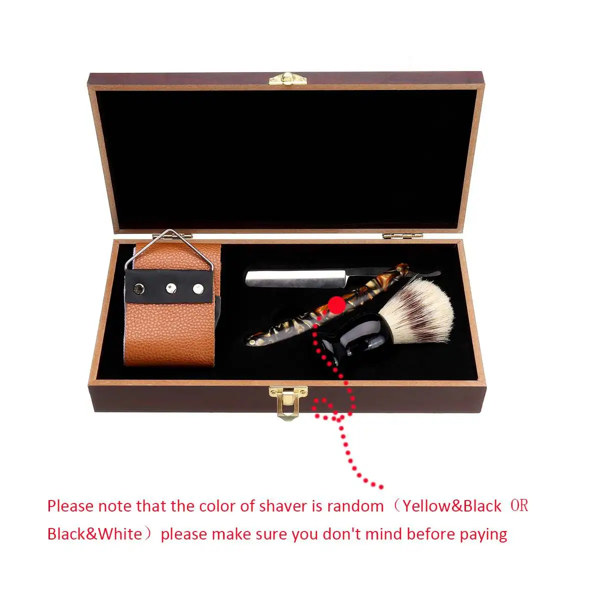 Упаковка включает: 1 x бритва (случайный цвет) 1 x Кисть 1 x Strop (случайный цвет) 1 x деревянная коробка Обратите внимание, что цвет ручки бритвы случайный (желтый, черный, черный и белый)