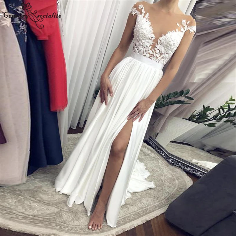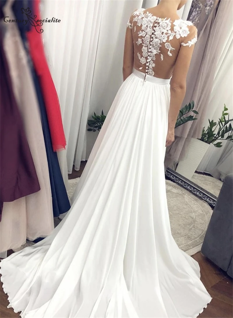 Свадебные платья в стиле бохо 2020, кружевное свадебное платье для женщин, прозрачные шифоновые пляжные наряды с рукавом-крылышком, круглым вырезом и пуговицами на спине, Vestido De Noiva