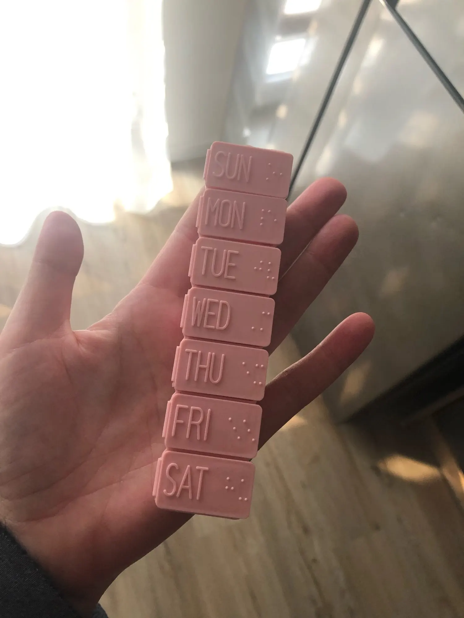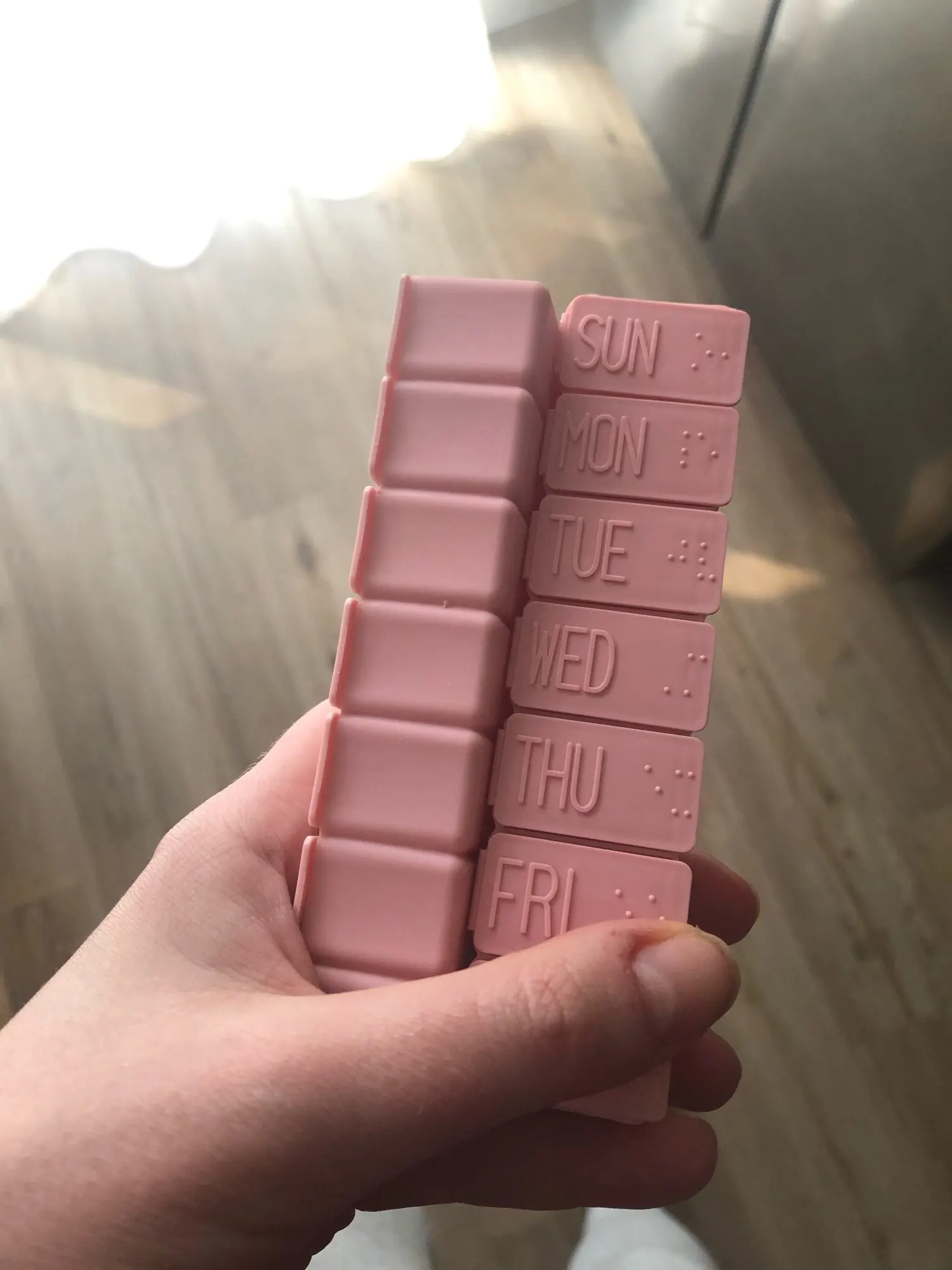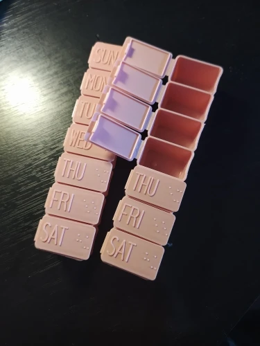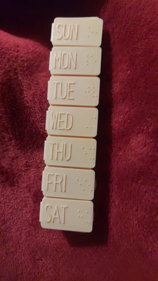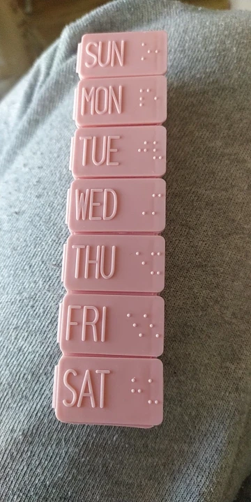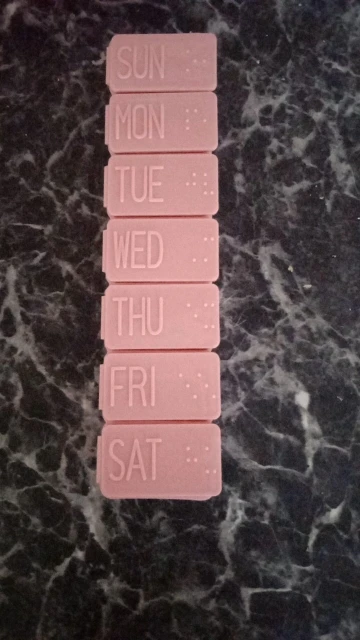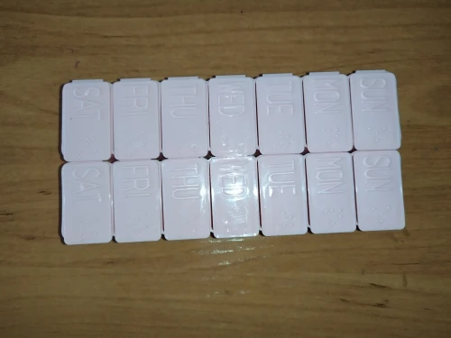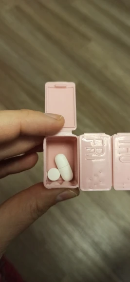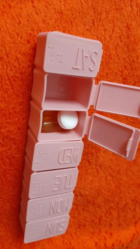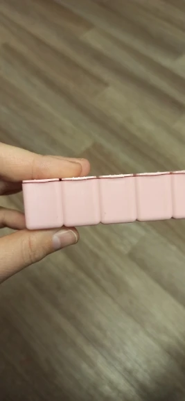 Таблетка длиной около 13 см. Очень удобно и практично носить с собой куда угодно, как сумку, так и рюкзак. Это пастельно-розовый цвет. Дни приходят в порядок от воскресенья до субботы на английском языке. Довольно легко открыть и с вместимостью между 4-5 таблеми в зависимости от их размера.