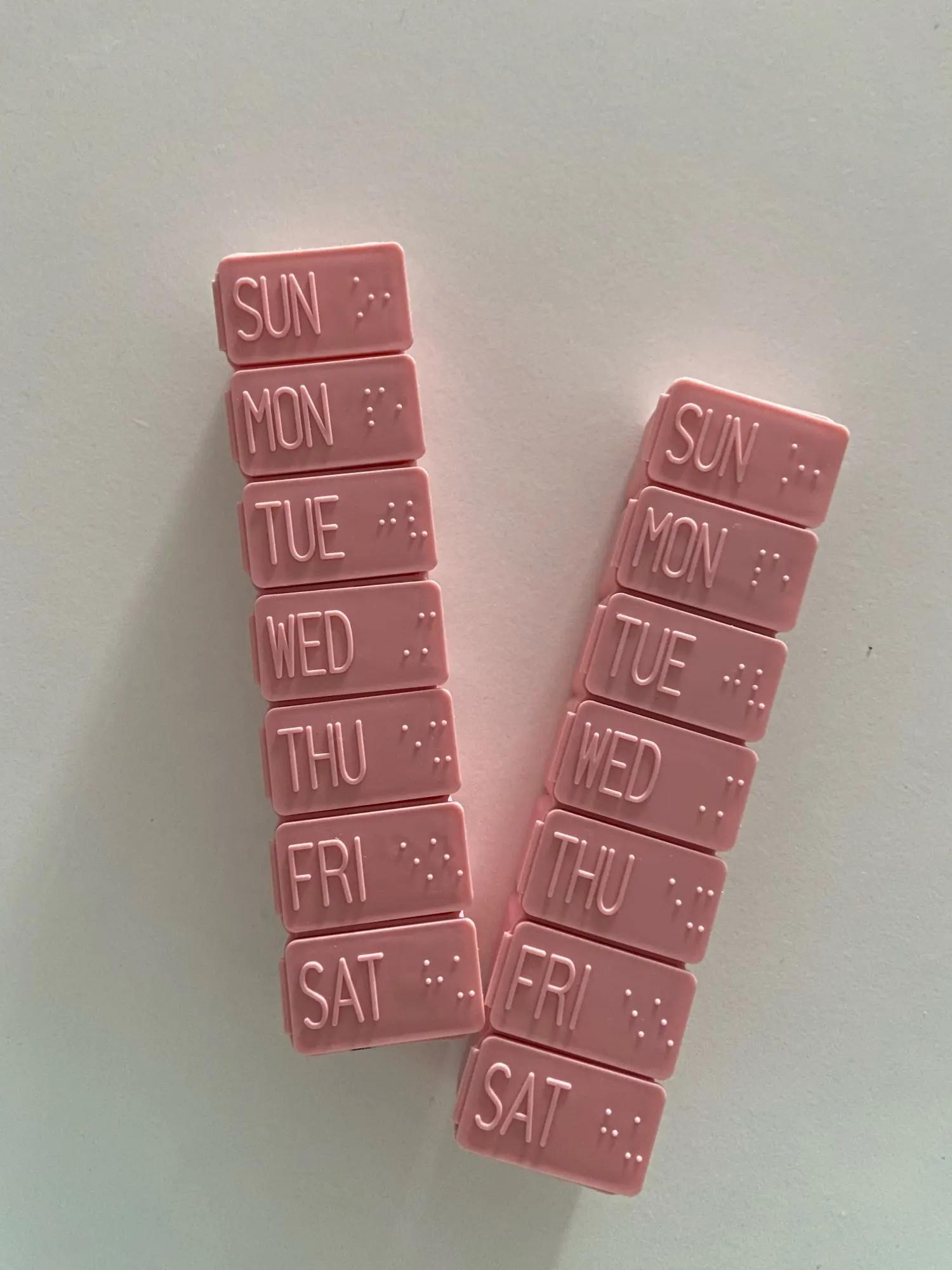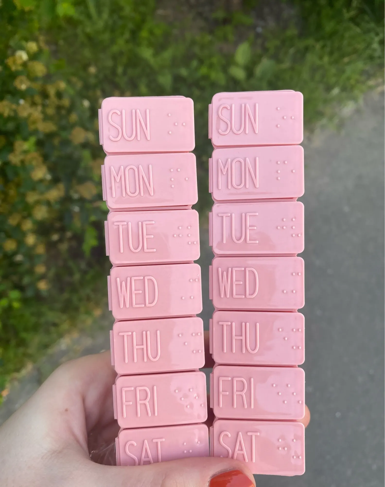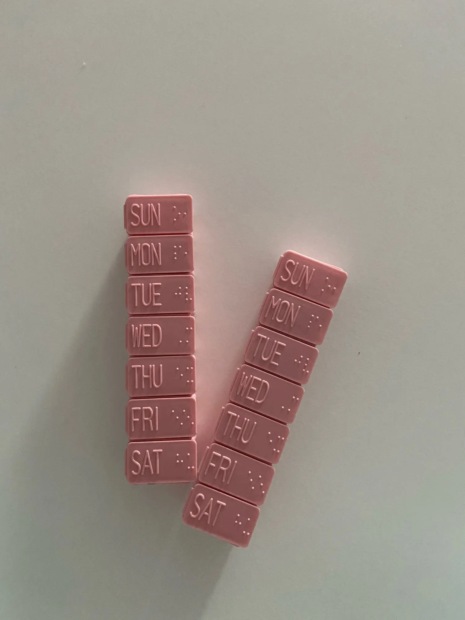 Таблетка длиной около 13 см. Очень удобно и практично носить с собой куда угодно, как сумку, так и рюкзак. Это пастельно-розовый цвет. Дни приходят в порядок от воскресенья до субботы на английском языке. Довольно легко открыть и с вместимостью между 4-5 таблеми в зависимости от их размера.