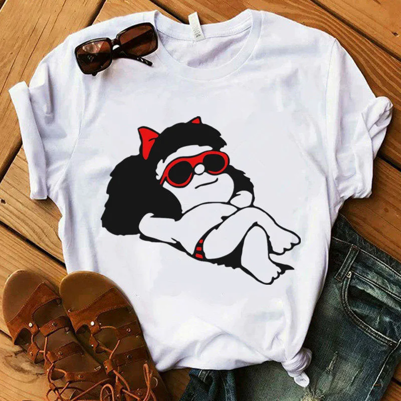 Mafalda футболка женская летняя обувь в стиле Харадзюку; Повседневные футболки с короткими рукавами в уличном стиле с О-образным вырезом Футболка 90s мультфильм футболка Femme