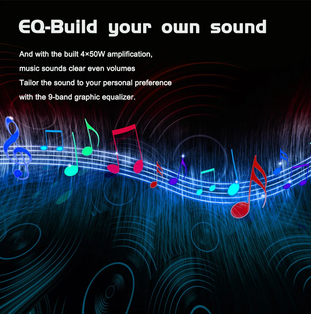 И со встроенным усилением 4 × 50 Вт музыка звучит четкими даже томами. По индивидуальному заказу звуковая с вашими личными предпочтениями с 9 графический эквалайзер