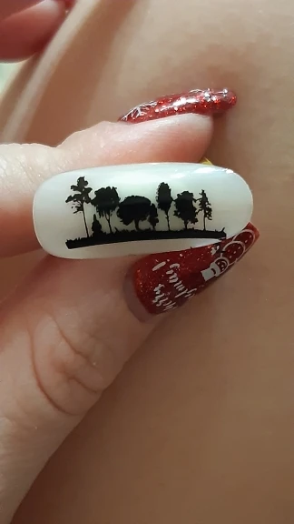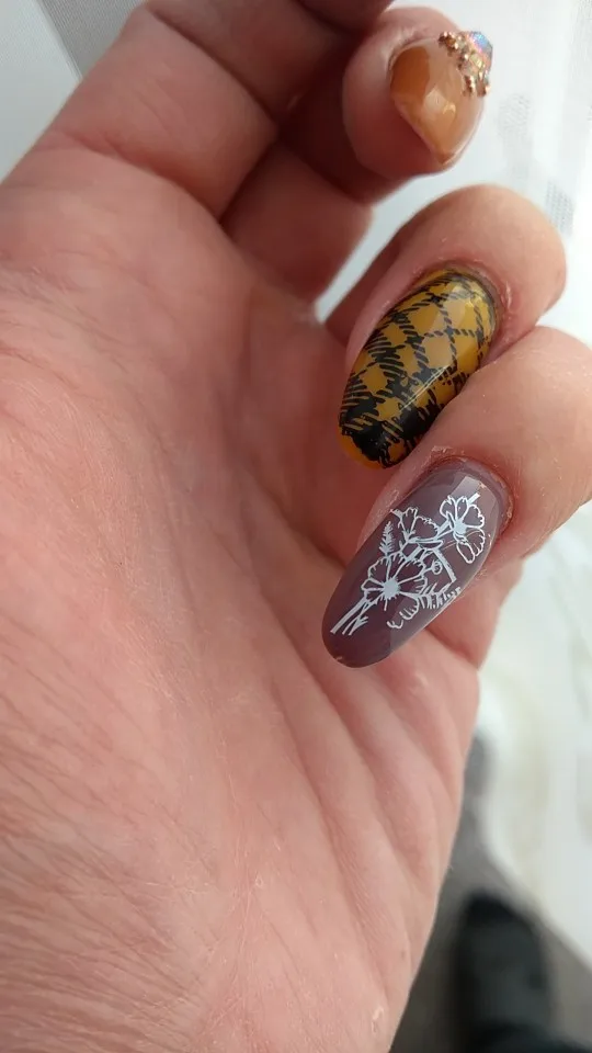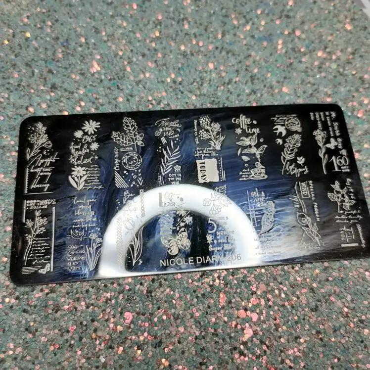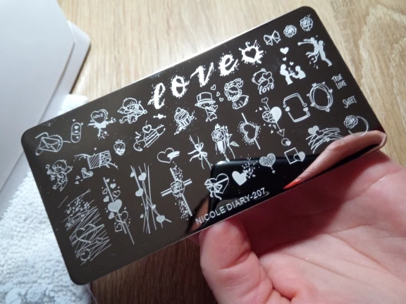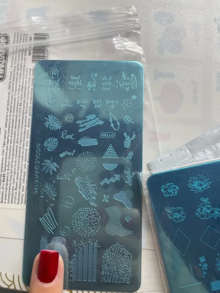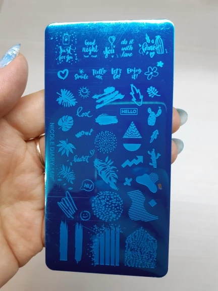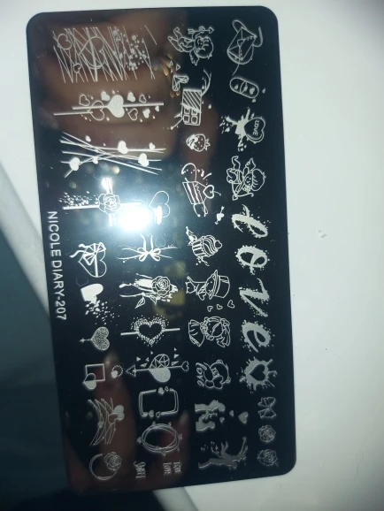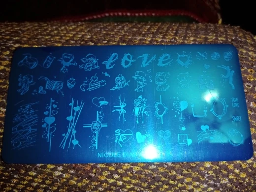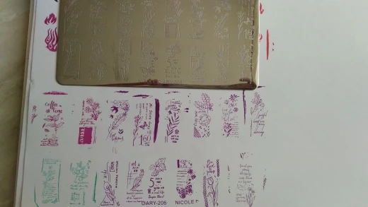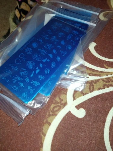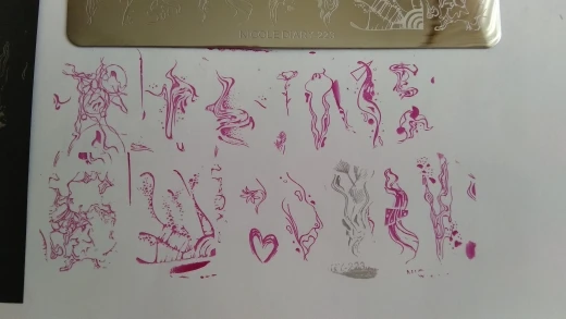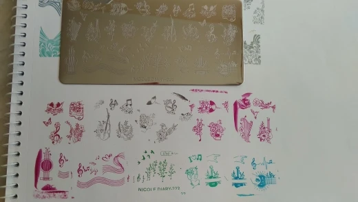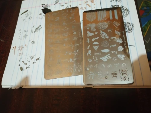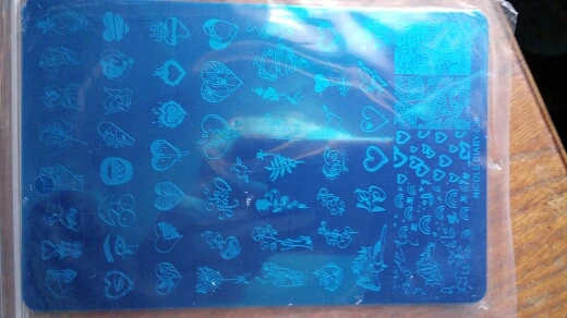 Трафареты работают только с гелевыми красками и то через раз. Лаки для стемпинга не хотят отпечатываться. Лаки проверенные, на других пластинах работают, на этих нет. Жаль. Рисунки хорошие, набрала этих пластин много, теперь расстроилась, так как с лаком больше люблю работать.