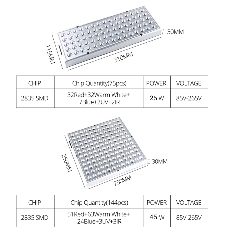 Наконечники: ИК, УФ-светодиоды выглядят тусклыми, это нормально, не волнуйтесь. Для энергосбережения дизайн, 25 Вт всего потребляет около 8 Вт Мощность, 45 Вт-14,5 W, намного лучше, чем тот же Продукт на рынке. Подходящее место: садоводческий саженец/парниковый растительный/комнатный растительный светильник Полный спектр: 25 Вт 2835 Чип 75 светодиодов; 45 Вт 2835 Чип 144 светодиодов; Светодиодный чип: 25 Вт 75 светодиодный s, красный: 32, Синий: 7, теплый белый: 32, УФ: 2, ИК: 2 45 Вт 144 светодиода, красный: 51, синий: 24, теплый белый: 63, УФ: 3, ИК: 3 Угол обзора светодиодов: 120 смешанных Рабочее широкое напряжение: от 85 В до 265 в можно использовать. Частота: 50/60 Гц; Сертификаты: CE, ROHS, FCC Советы по использованию:-Рекомендуемое Непрерывное время работы: 10-16 часов в день-только для использования в помещении, не является водонепроницаемым. Рекомендуемая высота растения: 12 "-50" в зависимости от различных этапов роста.