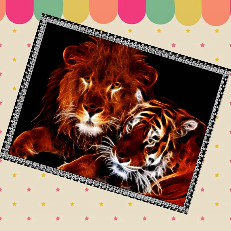 Светящийся Лев и тигр, алмазная живопись, животное на огне с круглой Стразы, изготовленная на заказ для вас