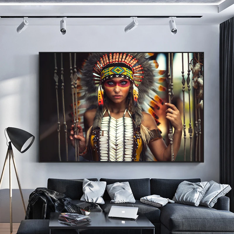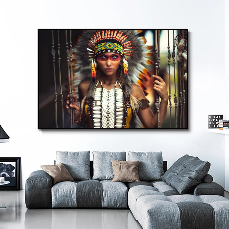 Красочная Женская Картина на холсте с перьями портрет девушки из Индии Холст Плакаты принты Настенная картина для гостиной домашний декор