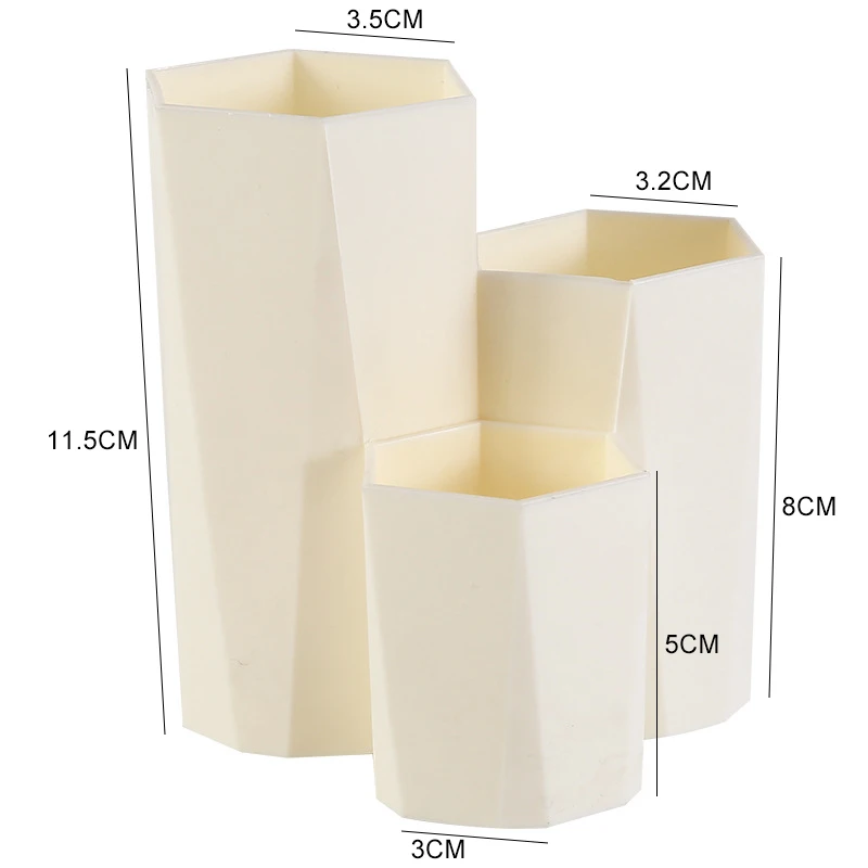 1. Классификация косметики и комбинированная трубка для хранения делятся на длинную трубку, среднюю трубку и короткую трубку. Он может хранить кисти для макияжа, карандаши для бровей, канцелярские принадлежности, лак для ногтей и т. д.2. Многофункциональная коробка для хранения может хранить различные кисти для макияжа, расчески и другую косметику; Она также может использоваться в качестве держателя ручки для хранения различных канцелярских товаров.3. Креативный шестиугольный призмовый дизайн, стабильное размещение, прочный и долговечный.
