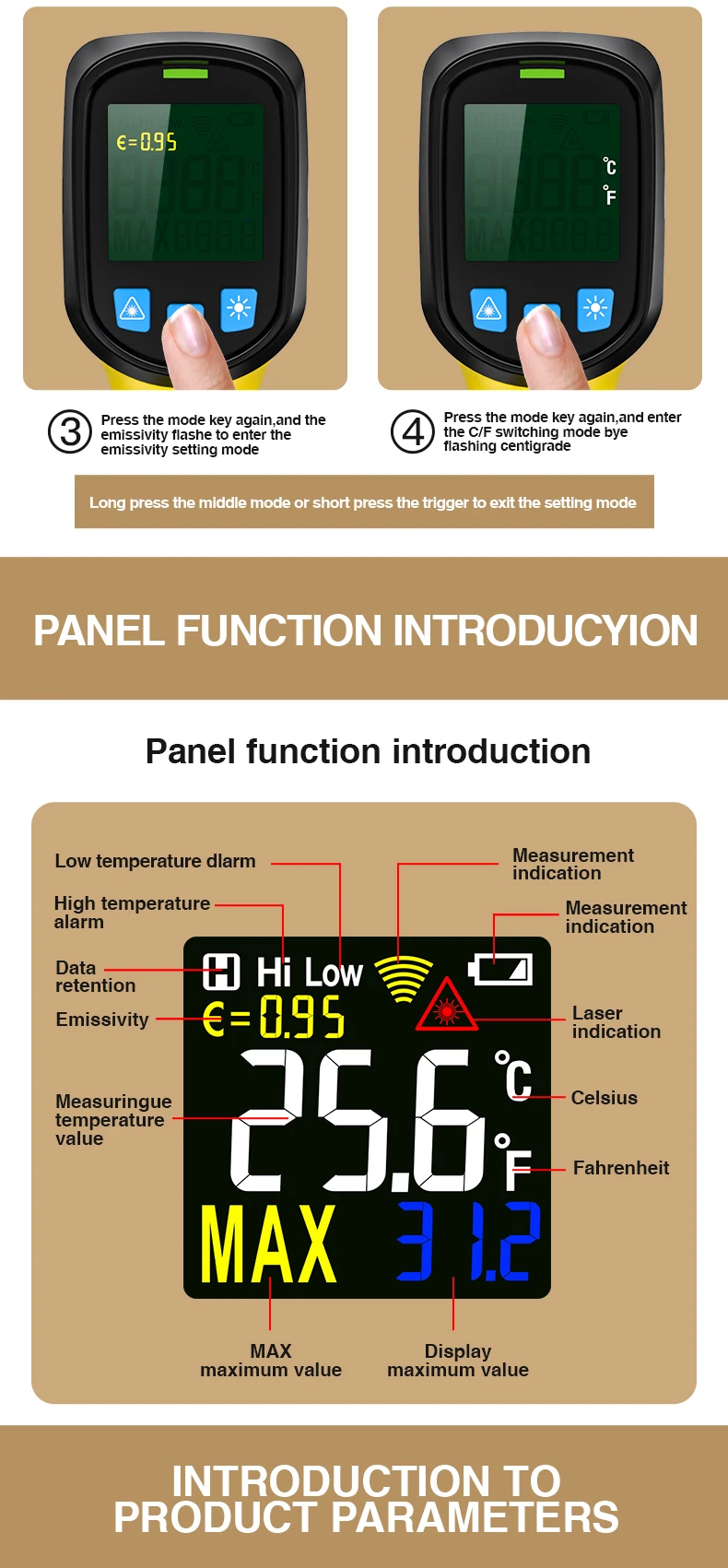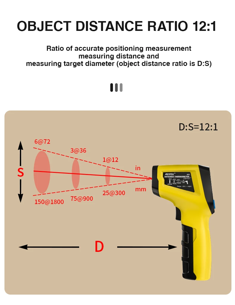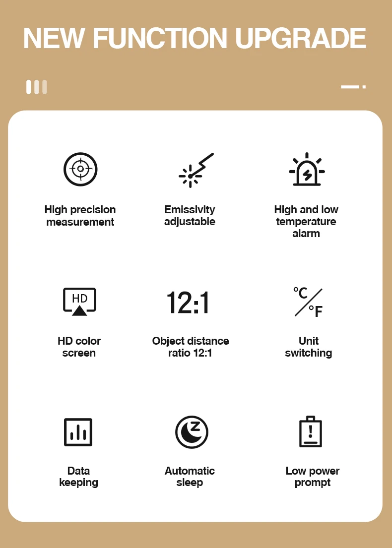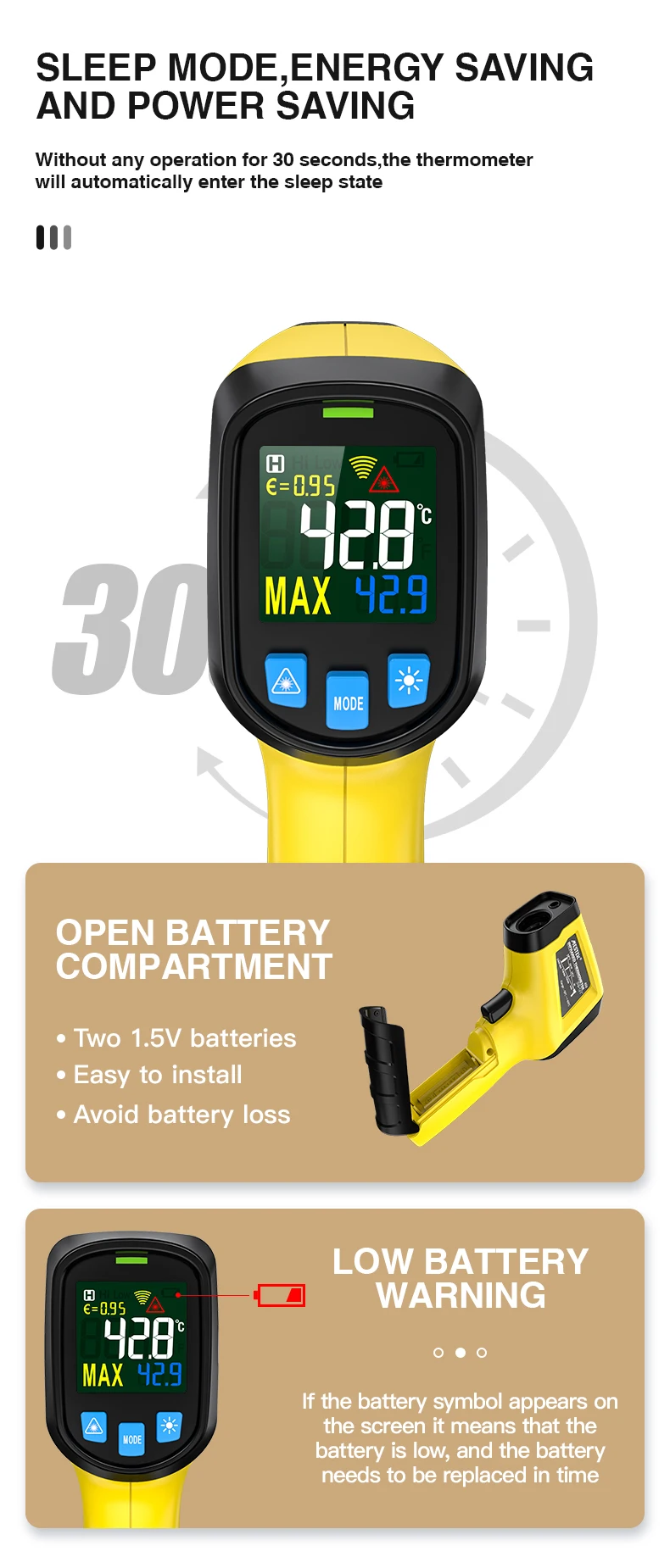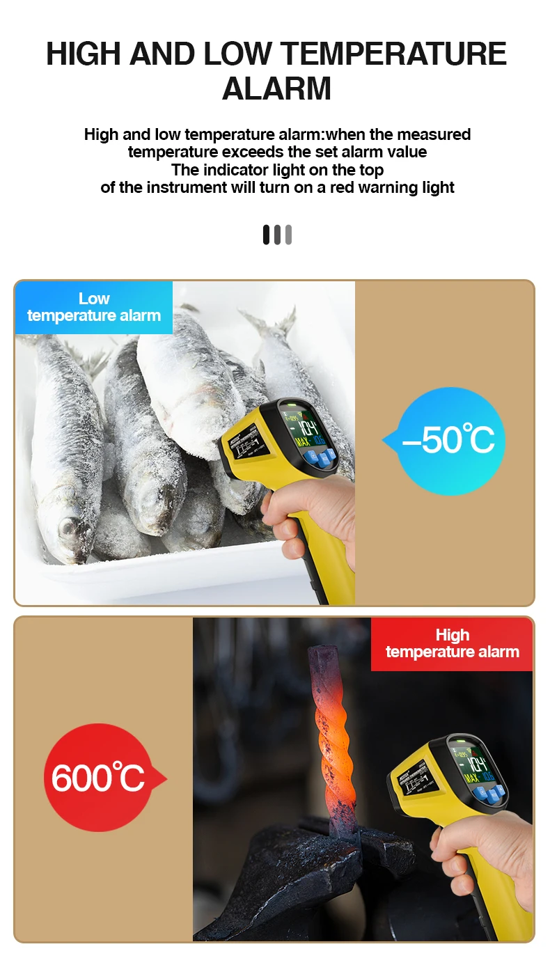Качественный пирометр! Все как в описании продавца. Быстрая доставка - 5 дней до Москвы EML. Фирменная упаковка в коробку и пупырку, инструкция на английском языке. При ярком дневном свете луч лазера почти не видно. Я получил термометр с "царапиной" на экране, но она была на пленке, которую нужно аккуратно оторвать!