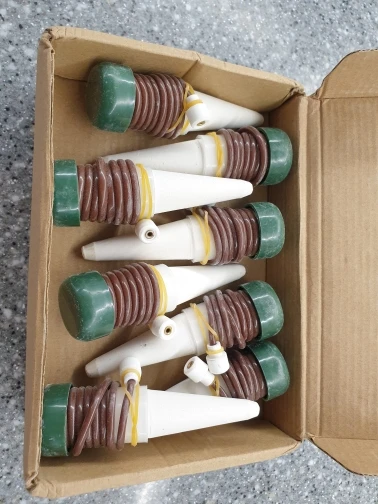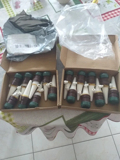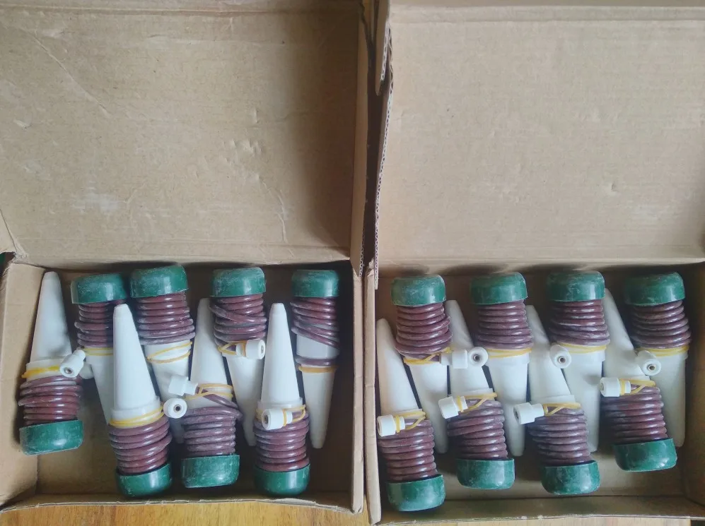 Доставка из Китая за 10 дней. Фарфоровые конусы с зеленой крышечкой и трубкой, как на сайте продавца. Упакованы были по 8 штук в двух коробках из гофрированного картона. Коробки помялись в дороге, но товар не поврежден. Спасибо, буду проверять эту систему в работе.