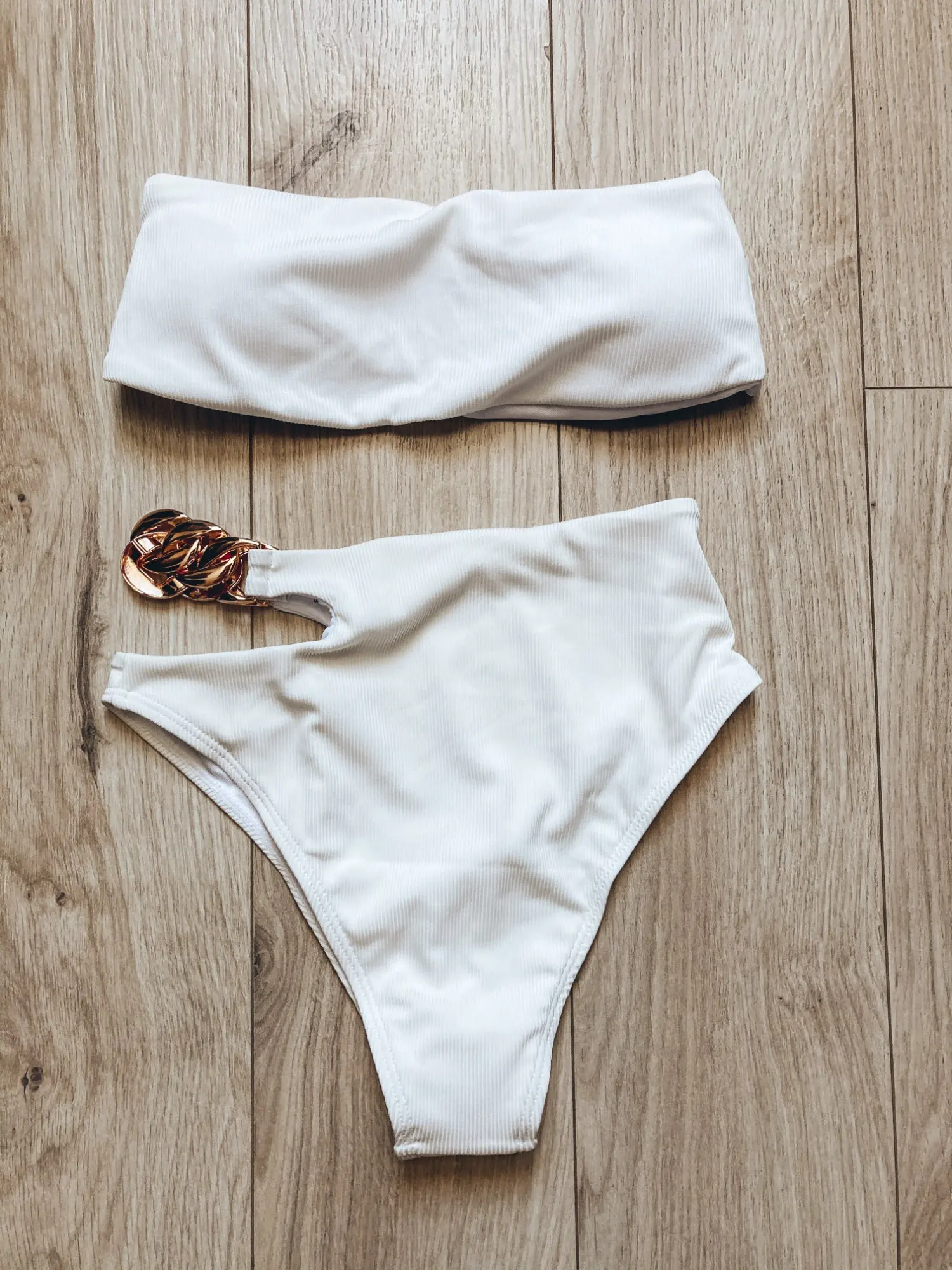 Очень эффектный купальник. Смотрится дорого и стильно. Ткань имеет чистый белый цвет. Есть подкладка. В груди есть вкладки. Цепь не дешёвая. Увесистая. Смотрится эффектно. Купальник смотрится дорого и стильно. На 88 – 60 – 94 грудь третий размер подошел идеально. Заказала эску