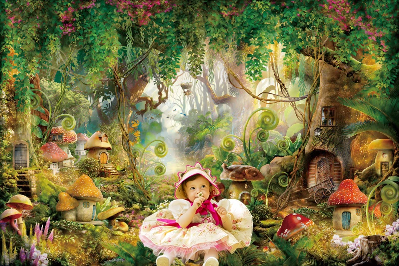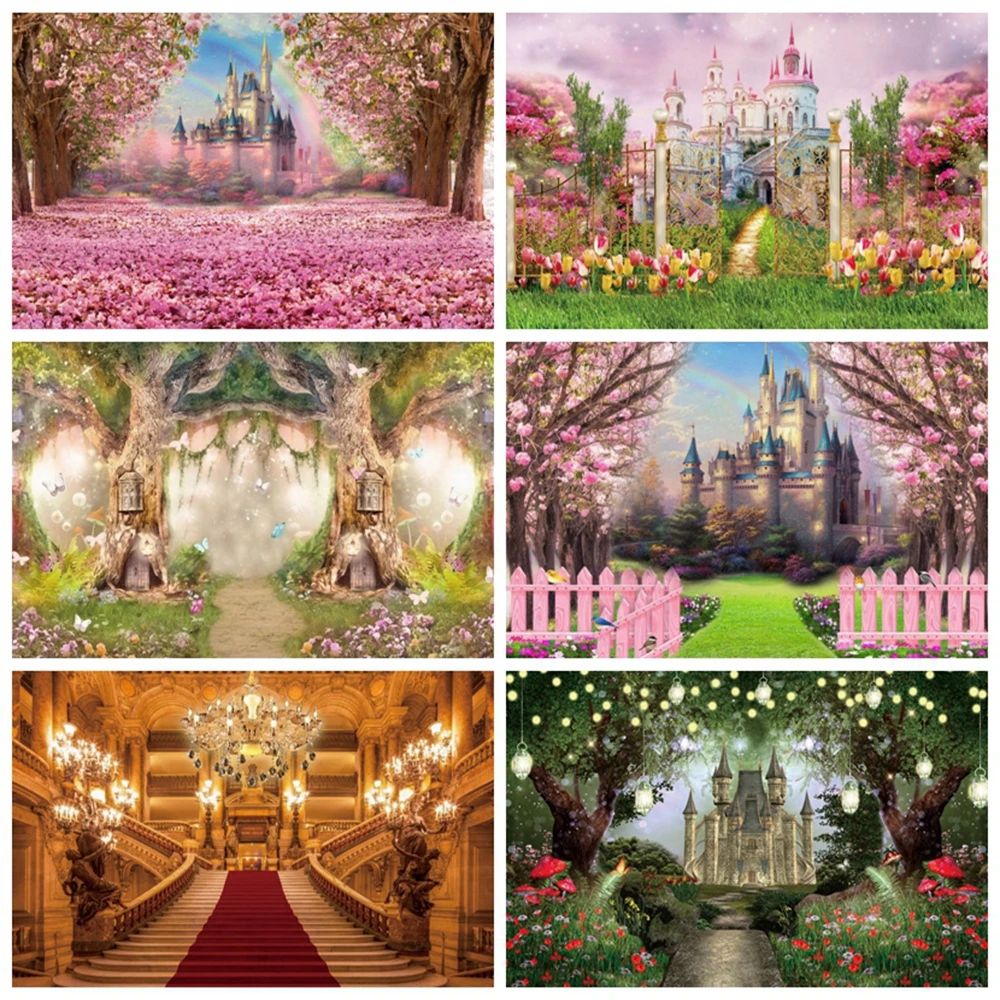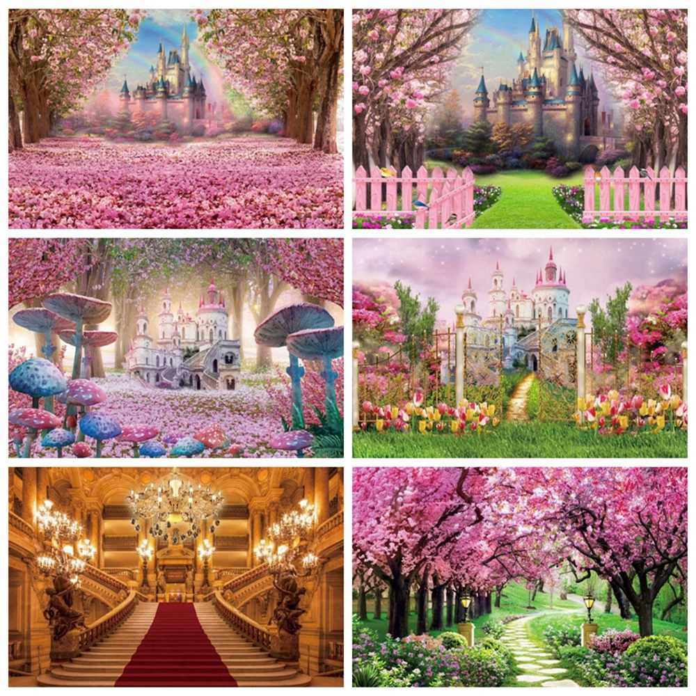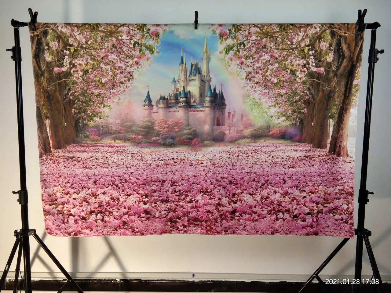 Фон для фотосъемки с изображением весеннего замка, цветов, морского леса